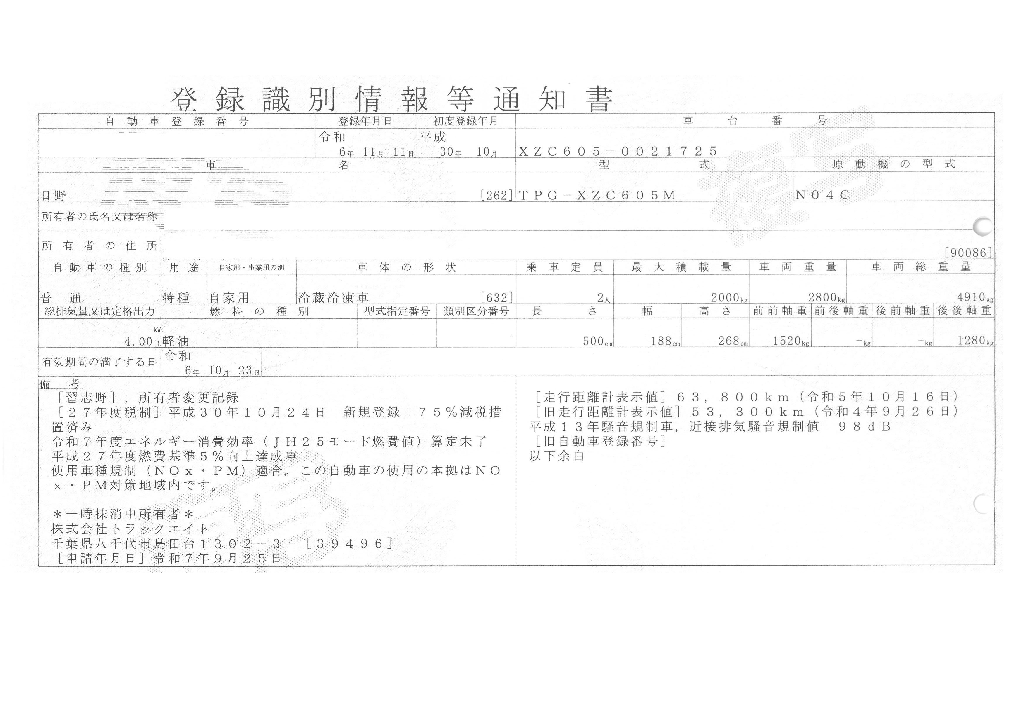 | 初年度登録 | 平成30年10月 | 型式 | TPG-XZC605M | 車検期限 | 一時抹消 |