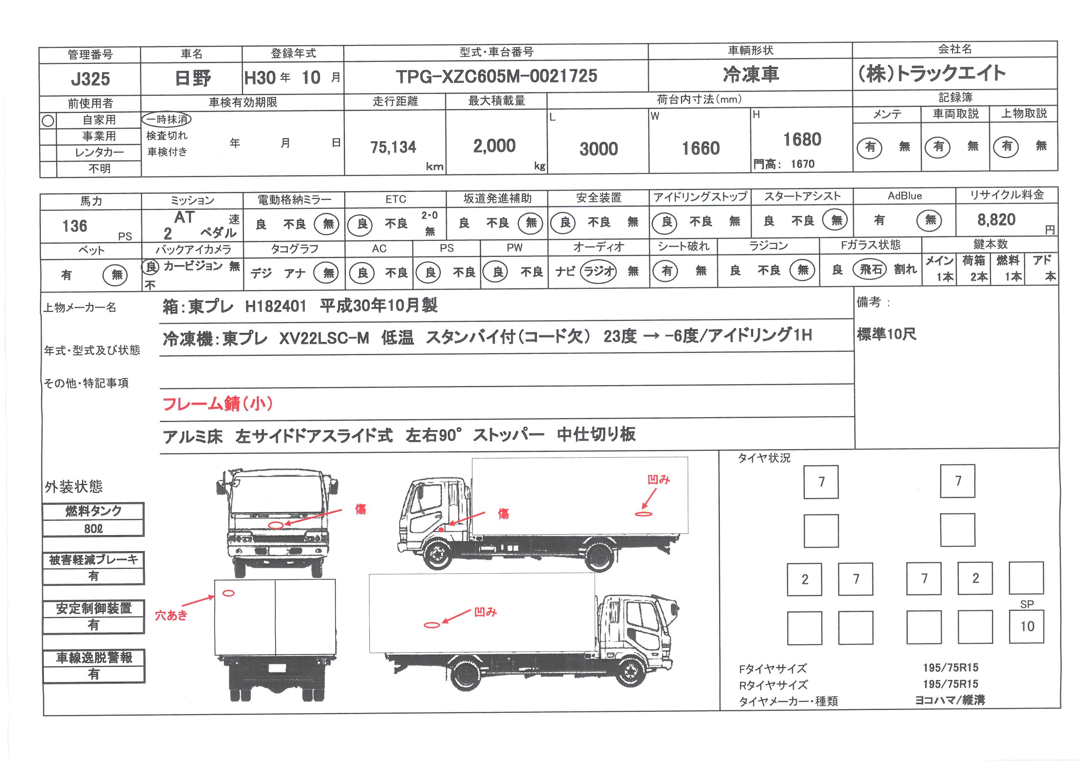 | 問合せ番号 | J325 [船橋在庫] | メーカー | 日野 | 形状 | 冷凍車 |