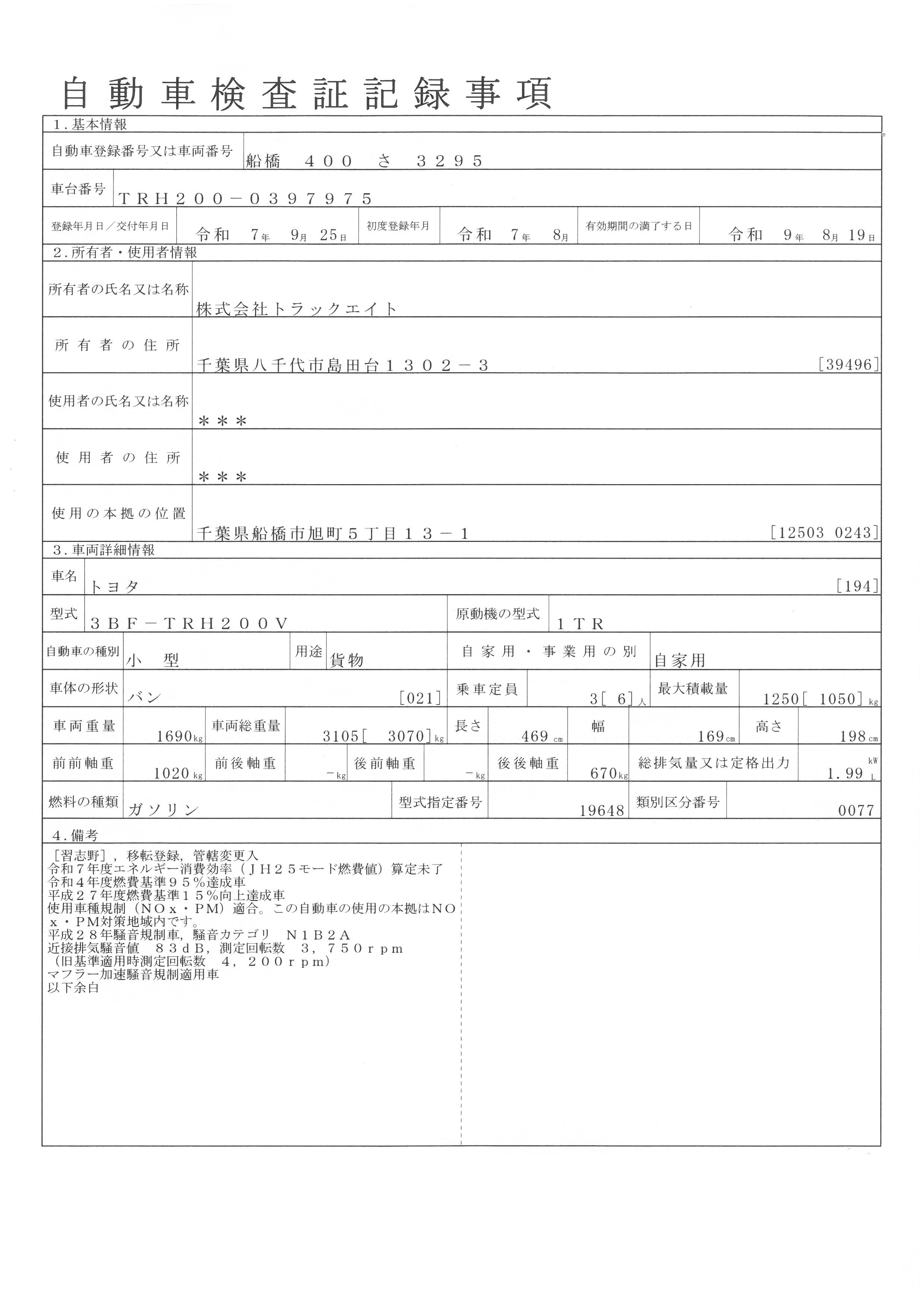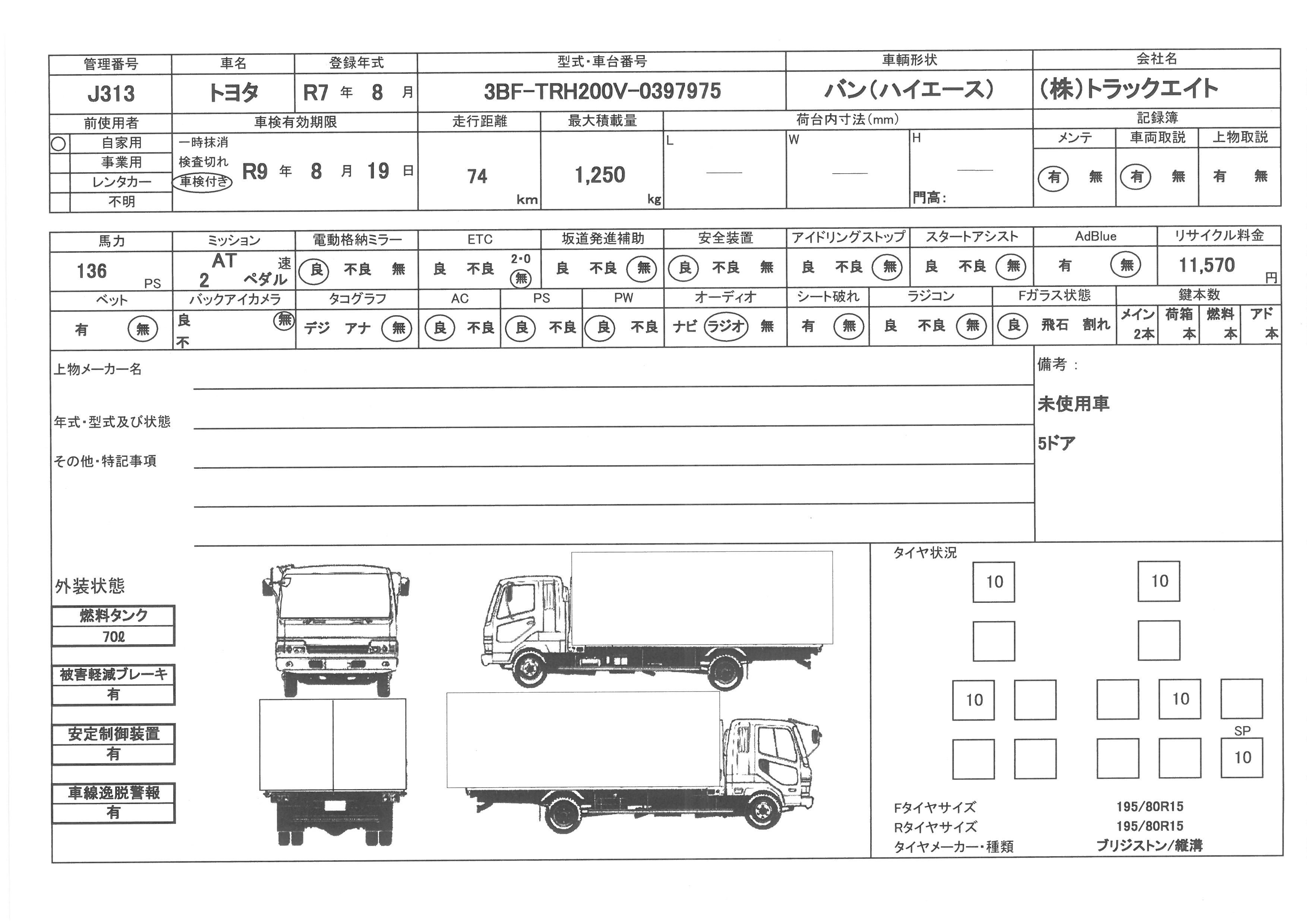 トヨタ 令和7年式 ハイエース DX GLパッケージ ロング 5ドア トラック情報 その他J313 by 鈴木英治. 車両情報 問合せ番号 J313 [船橋在庫] メーカー トヨタ 形状 ハイエース 初年度登録 令和7年8月 型式 3BF-TRH200V 車検期限 令和9年8月19日 走行距離 1千km リサイクル料 11570円 積載量 1250 [1050] kg 馬力 136PS ミッション AT エンジン型式 1TR 上物 上物形式 荷台寸法 ボディー仕様 セールスポイント 未使用車 ハイエース DX GLパッケージ ロング 5ドア ガソリン車 車検証 状態表