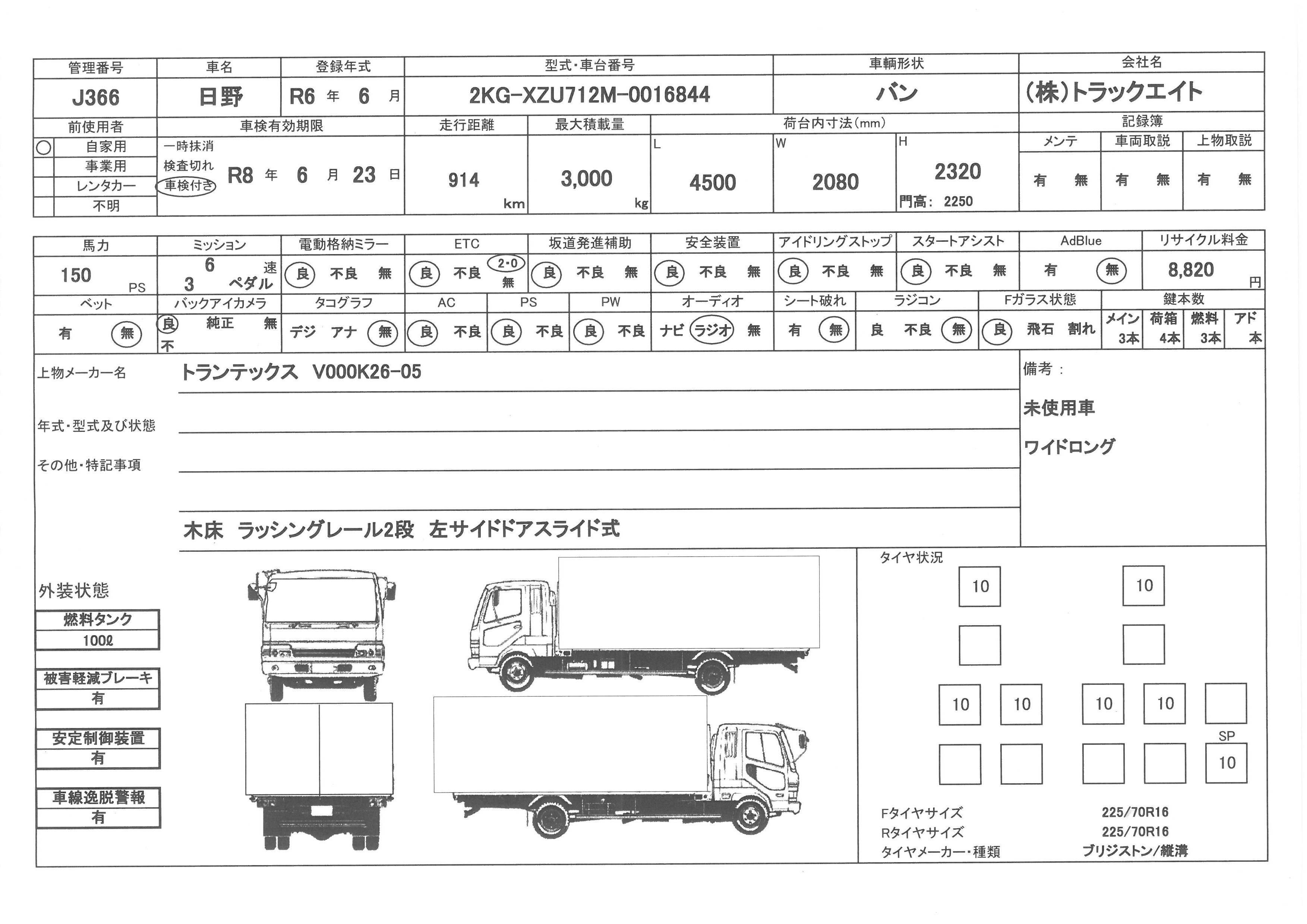 | 走行距離 | 1千km | リサイクル料 | 8820円 | 積載量 | 3000㎏ |
