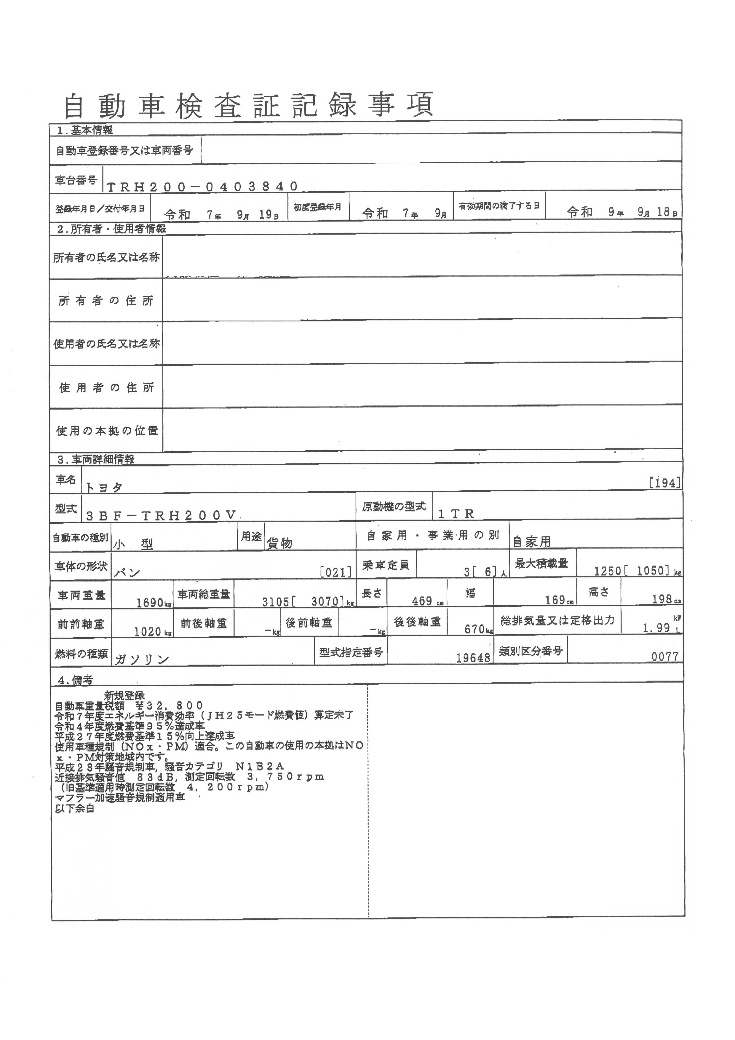 トヨタ 令和7年式 ハイエース DX GLパッケージ ロング 5ドア トラック情報 その他J357 by 鈴木英治. 売約済み 車両情報 問合せ番号 J357 [八千代在庫] メーカー トヨタ 形状 ハイエース 初年度登録 令和7年9月 型式 3BF-TRH200V 車検期限 令和9年9月18日 走行距離 1千km リサイクル料 11570円 積載量 1250[1050]kg 馬力 136PS ミッション AT エンジン型式 1TR 上物 上物形式 荷台寸法 ボディー仕様 セールスポイント 未使用車 ハイエース DX GLパッケージ ロング 5ドア ガソリン車 車検証 状態表