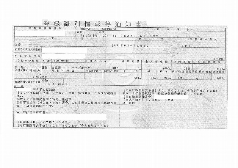 | 初年度登録 | 平成29年6月 | 型式 | TPG-FEA50 | 車検期限 | 一時抹消 |
