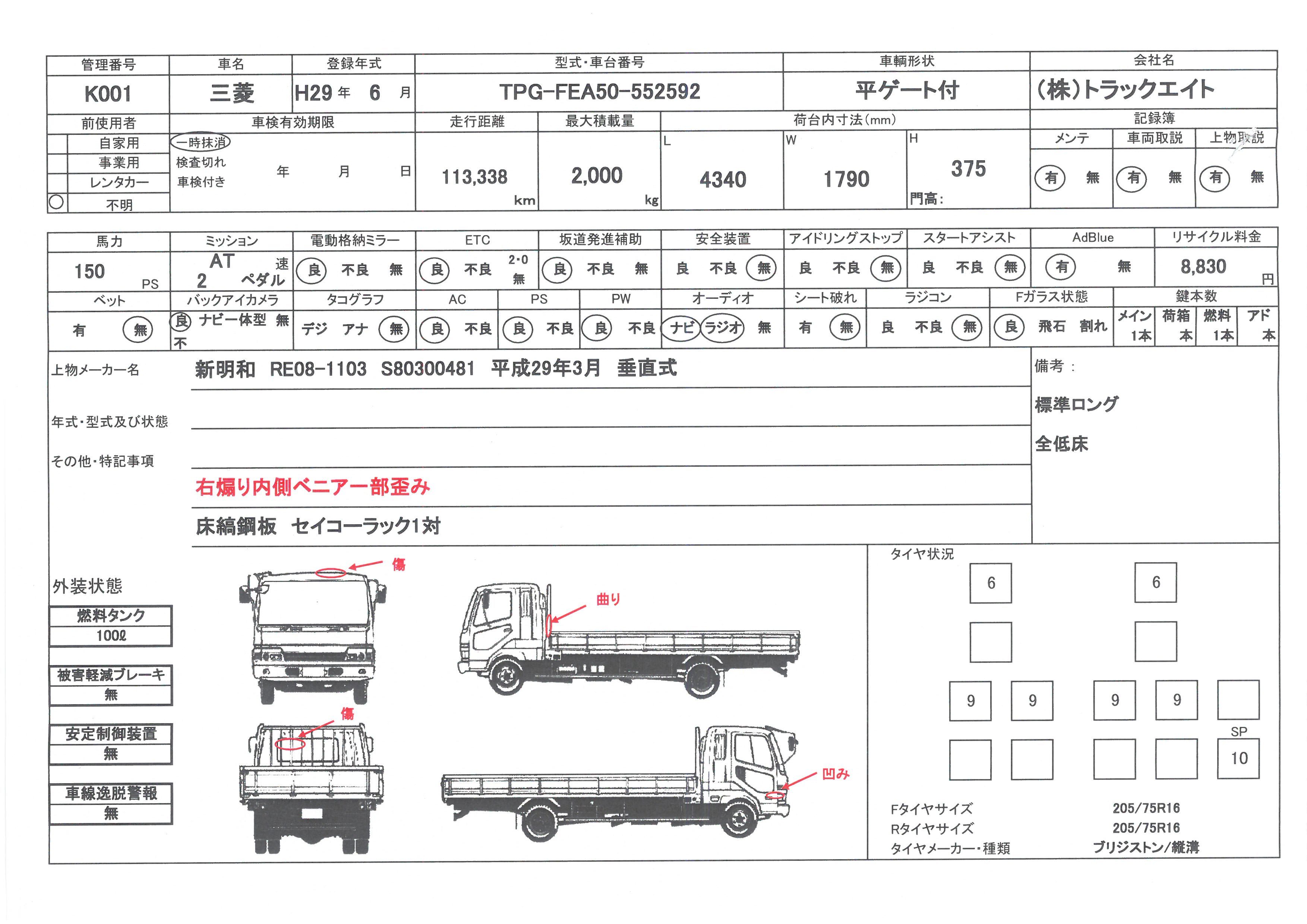 | 走行距離 | 113千km | リサイクル料 | 8830円 | 積載量 | 2000㎏ |