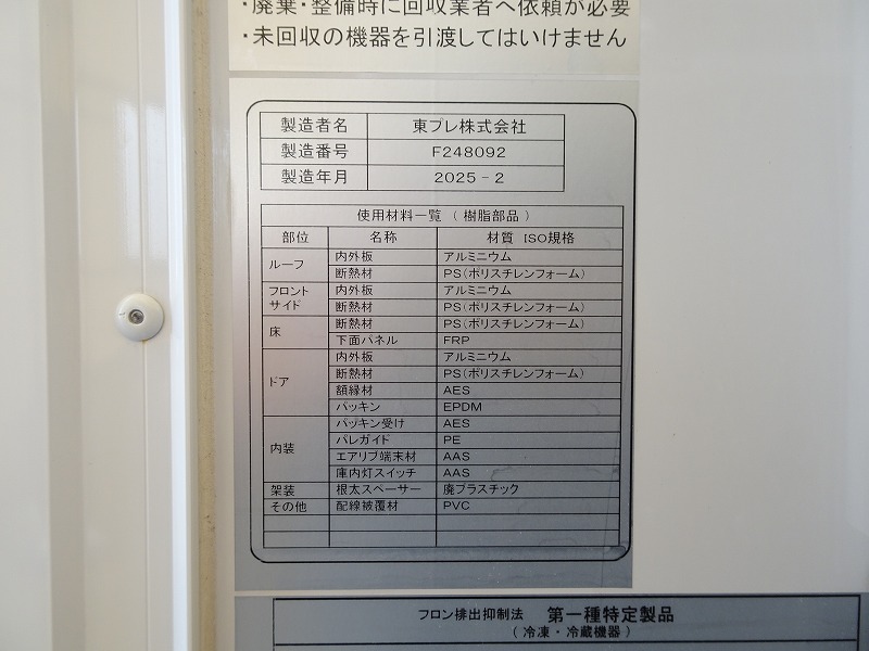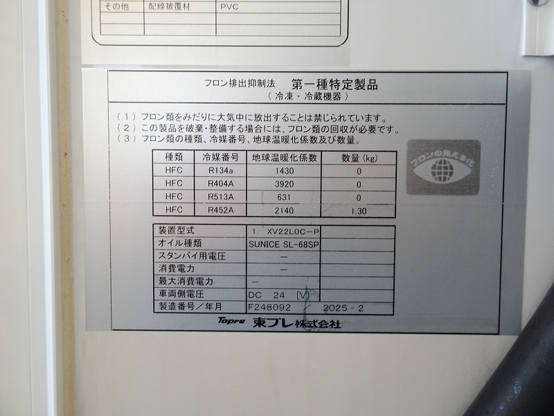 | ボディー仕様 | 東プレXV22LOC 低温 -30度設定 -27度確認/1h 床ステンベタ ラッシングレール1段 左側サイドドアスライド式 | ||||