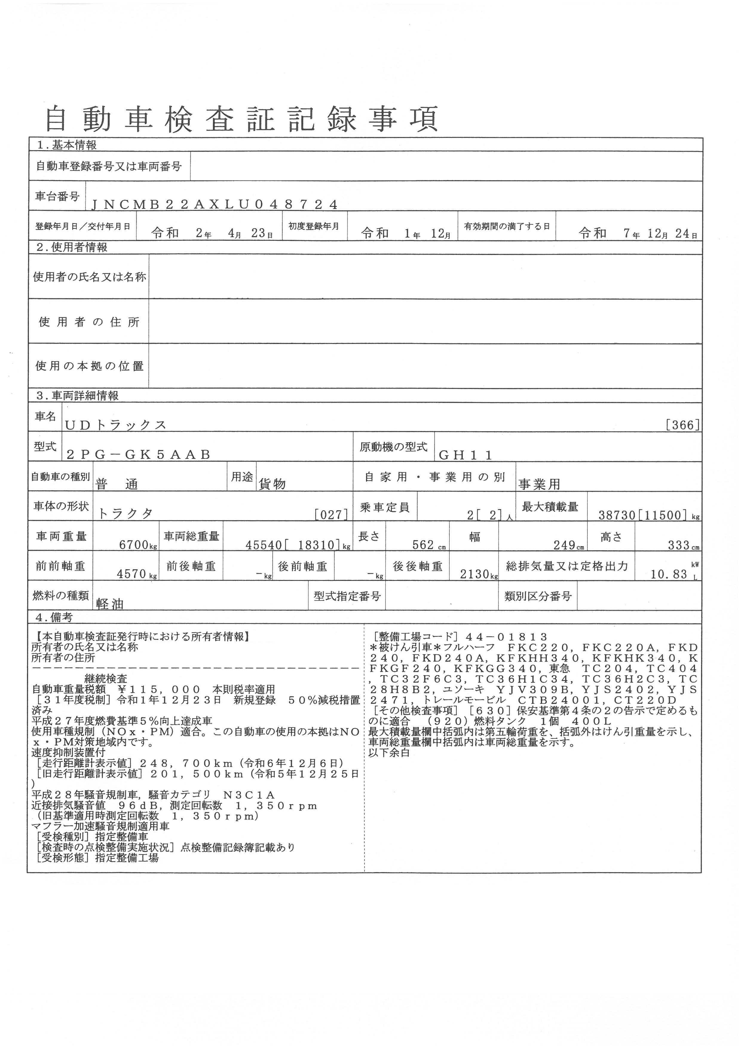 問合せ番号 K011[八千代在庫] メーカー UD 形状 トラクタ
