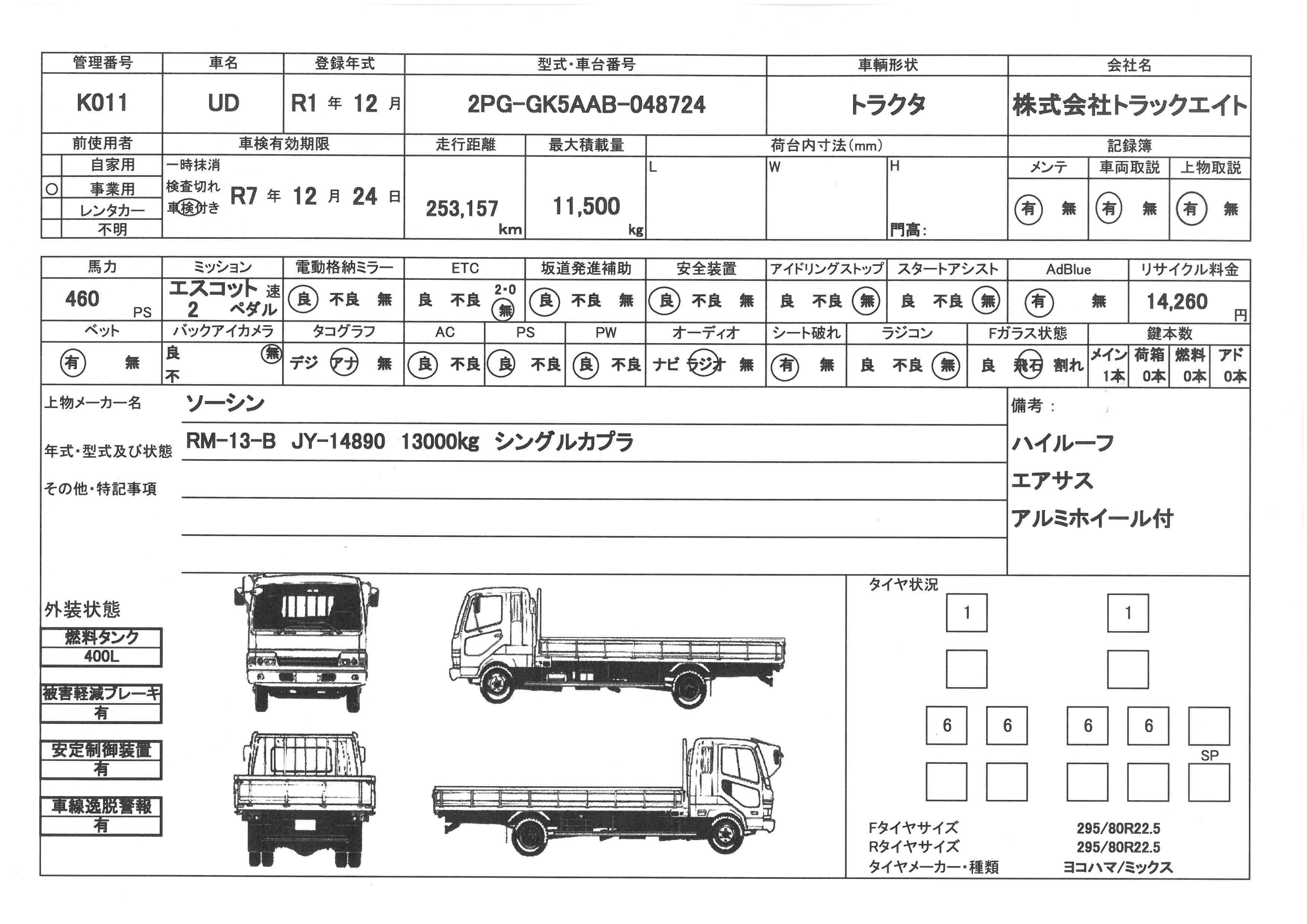 走行距離 253千km リサイクル料 14260円 積載量 11500㎏