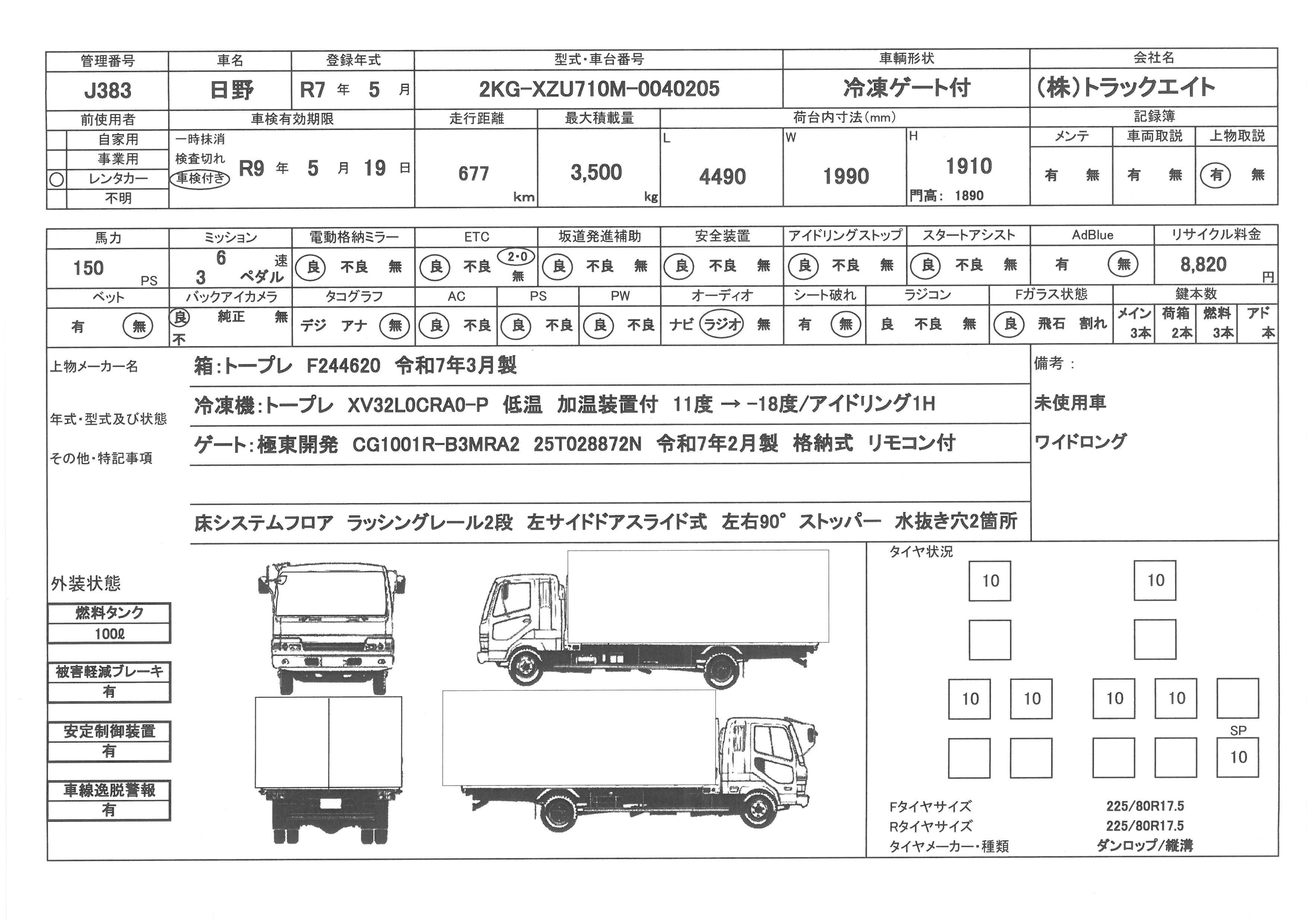 問合せ番号 J383 [船橋在庫] メーカー 日野 形状 冷凍ゲート付