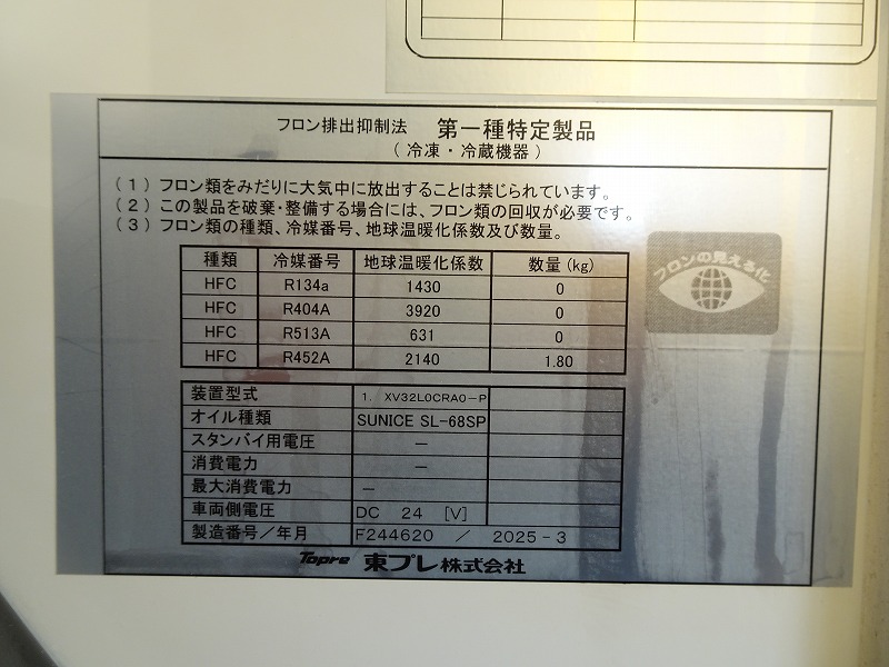 | ボディー仕様 | 東プレXV32LOC 低温 -30度設定 -18度確認/1h 加温装置付 システムフロア ラッシングレール2段 左側サイドドアスライド式 極東製格納式パワーゲート | ||||