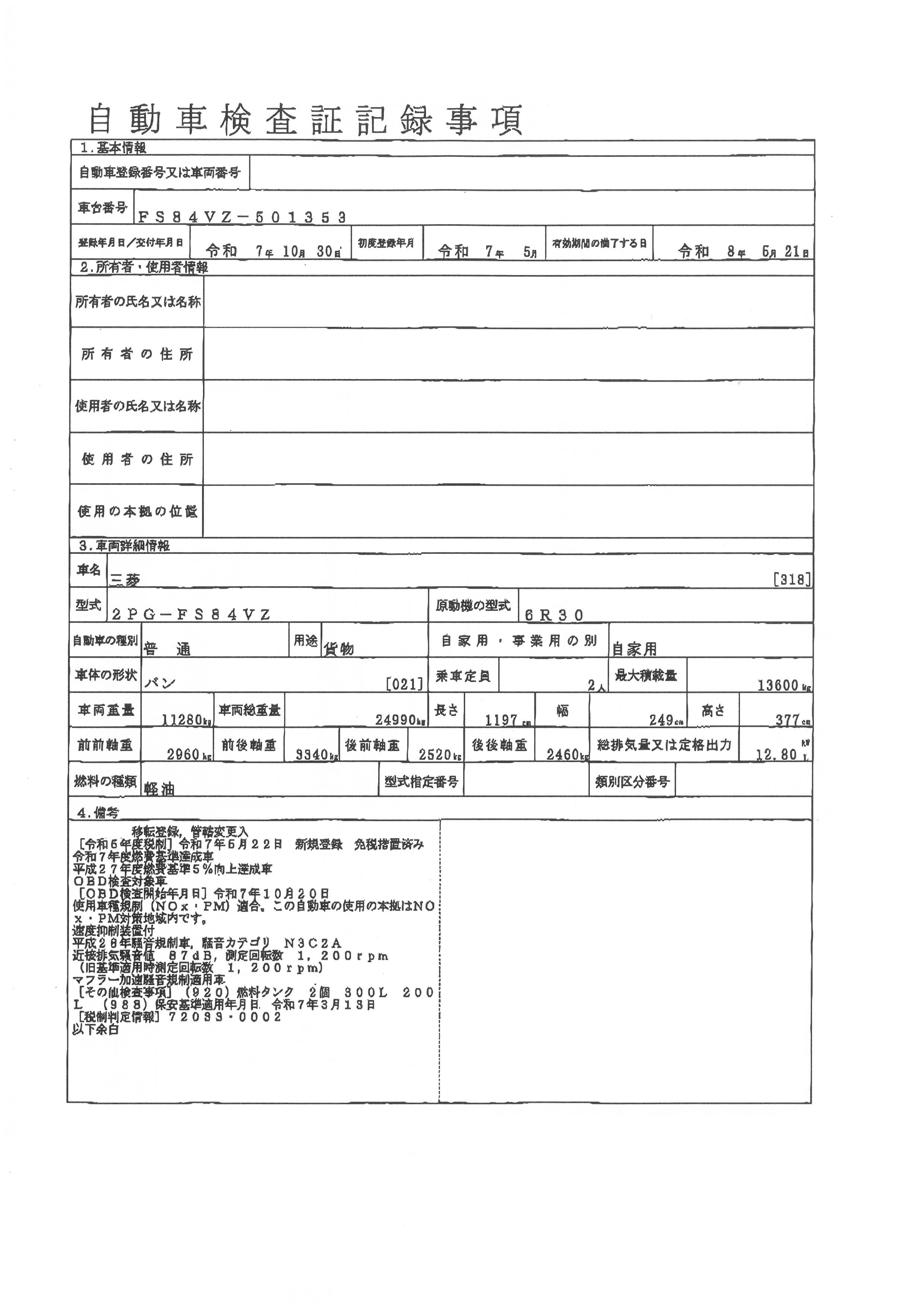 初年度登録 令和7年5月 型式 2PG-FS84VZ 車検期限 令和8年5月21日