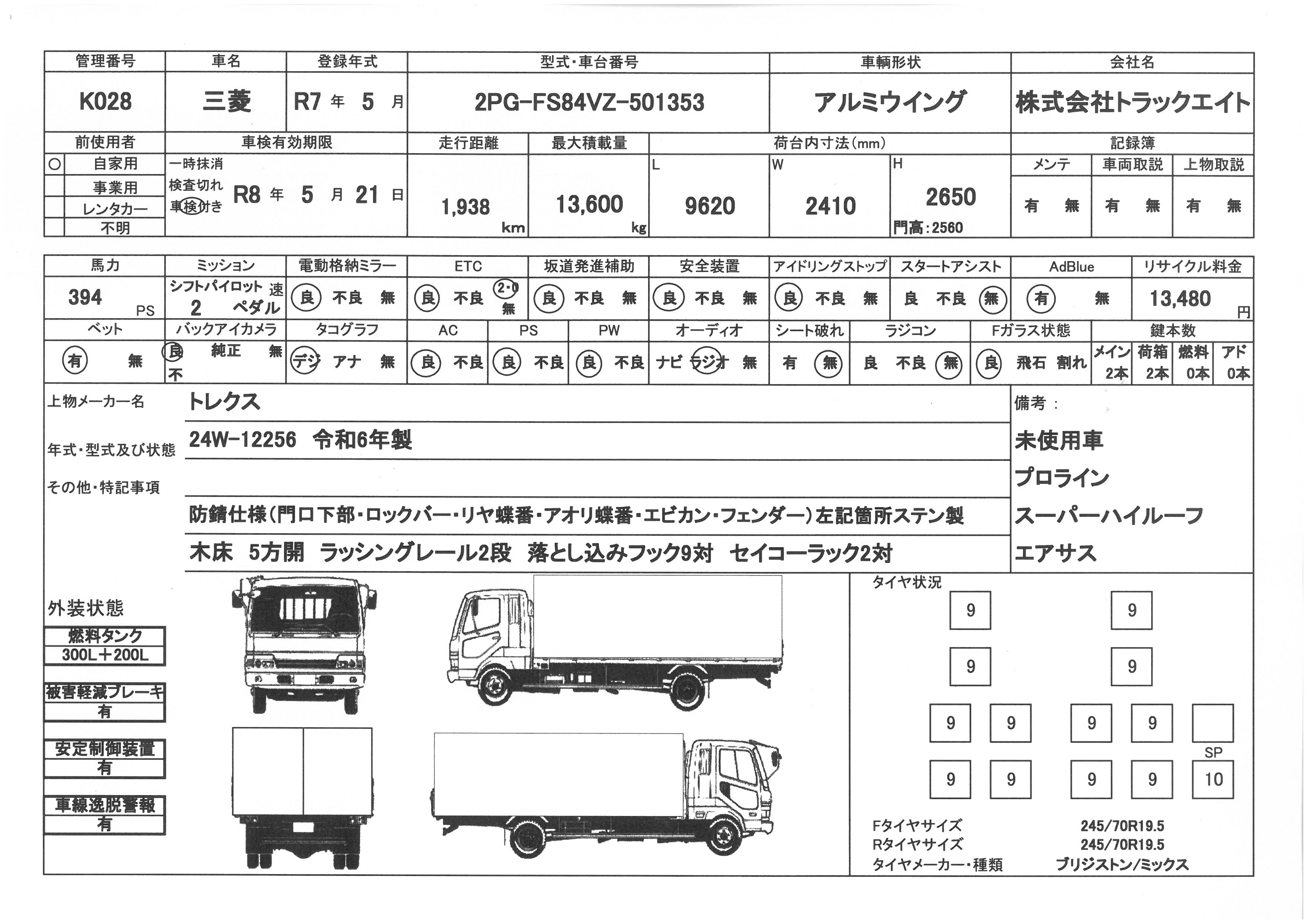 走行距離 2千km リサイクル料 13480円 積載量 13600㎏