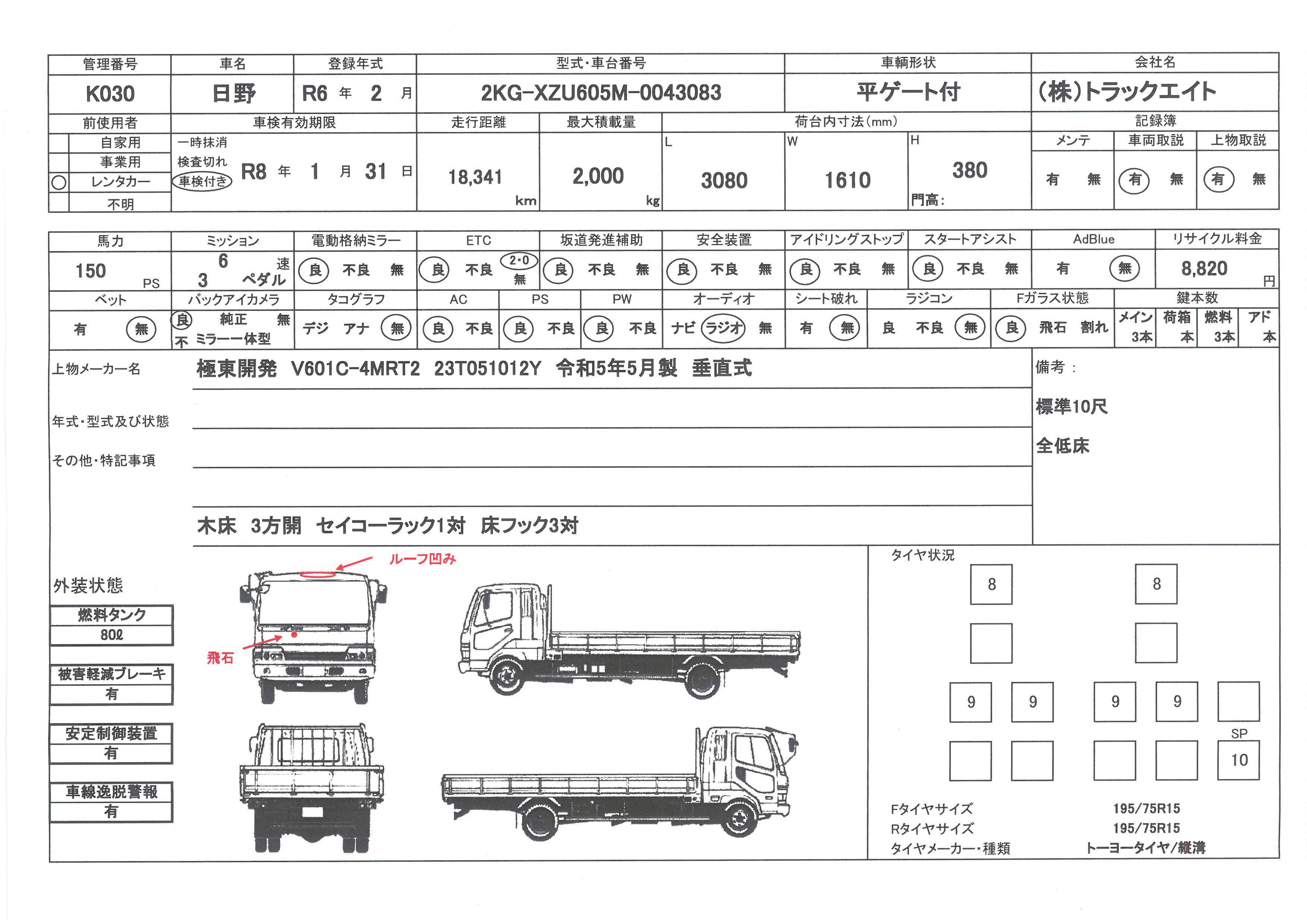 | 問合せ番号 | K030 [船橋在庫] | メーカー | 日野 | 形状 | 平ゲート付 |