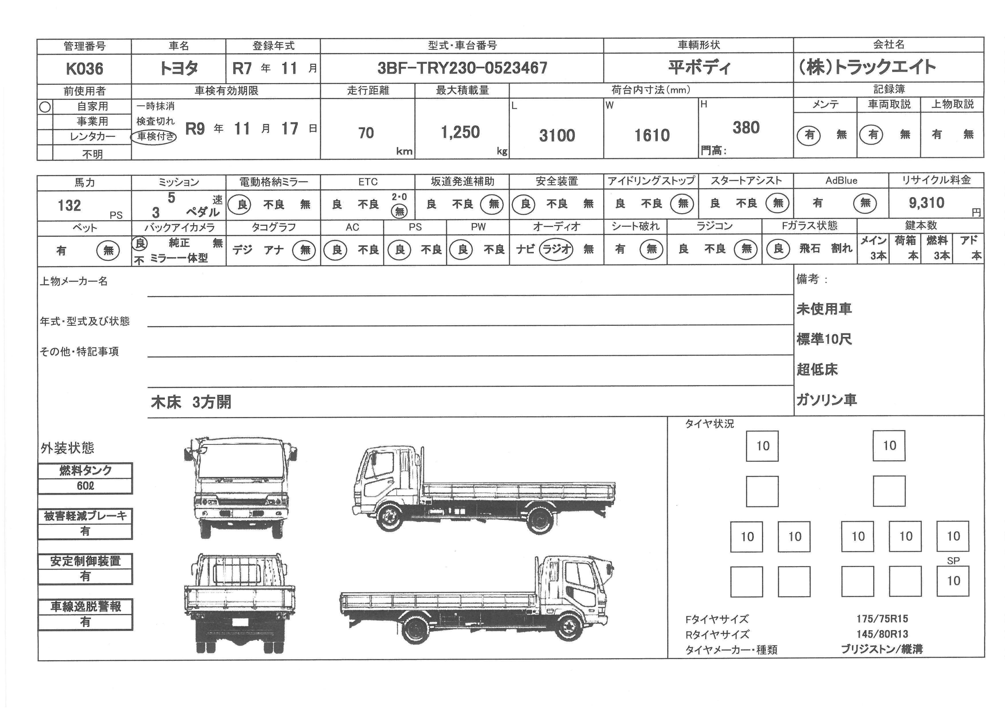 問合せ番号 K036 [船橋在庫] メーカー トヨタ 形状 平ボディー