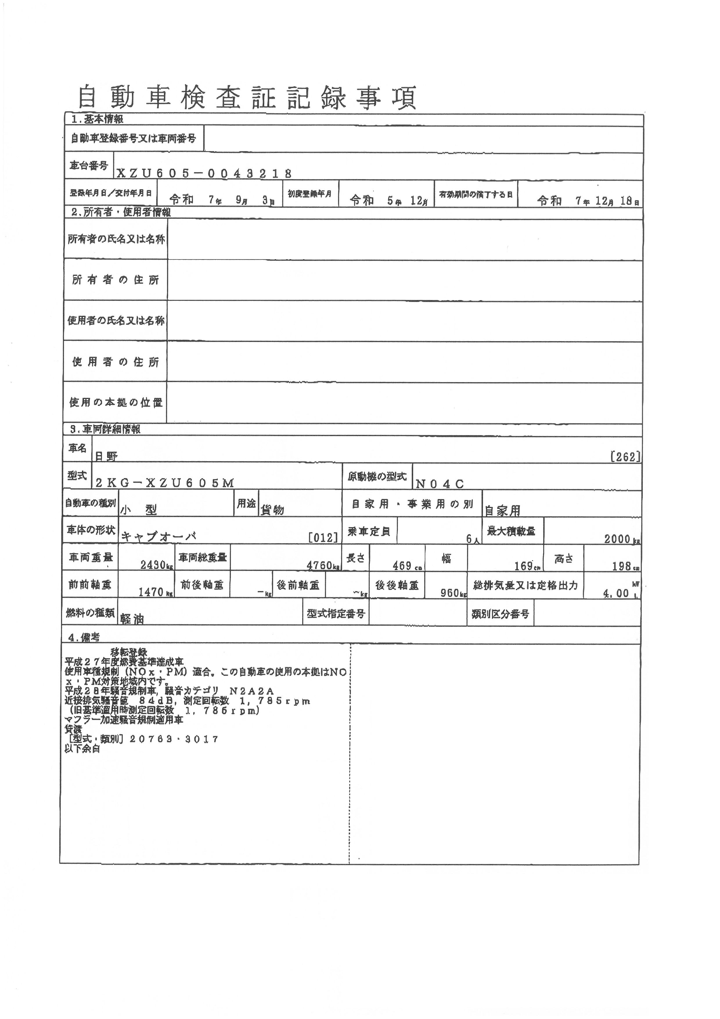 日野 令和5年式 Wキャブ 標準10尺 全低床 2t積載 トラック情報 平ボディ車K032 by 鈴木英治. 車両情報 問合せ番号 K032 [船橋在庫] メーカー 日野 形状 Wキャブ 初年度登録 令和5年12月 型式 2KG-XZU605M 車検期限 一時抹消 走行距離 31千km リサイクル料 10040円 積載量 2000㎏ 馬力 150PS ミッション 6速 エンジン型式 N04C 上物 上物形式 荷台寸法 2.09×1.61×0.38 ボディー仕様 木床 3方開 床フック3対 セールスポイント 標準10尺 全低床 L2090 2t積載 木製煽り3方開 車検証 状態表