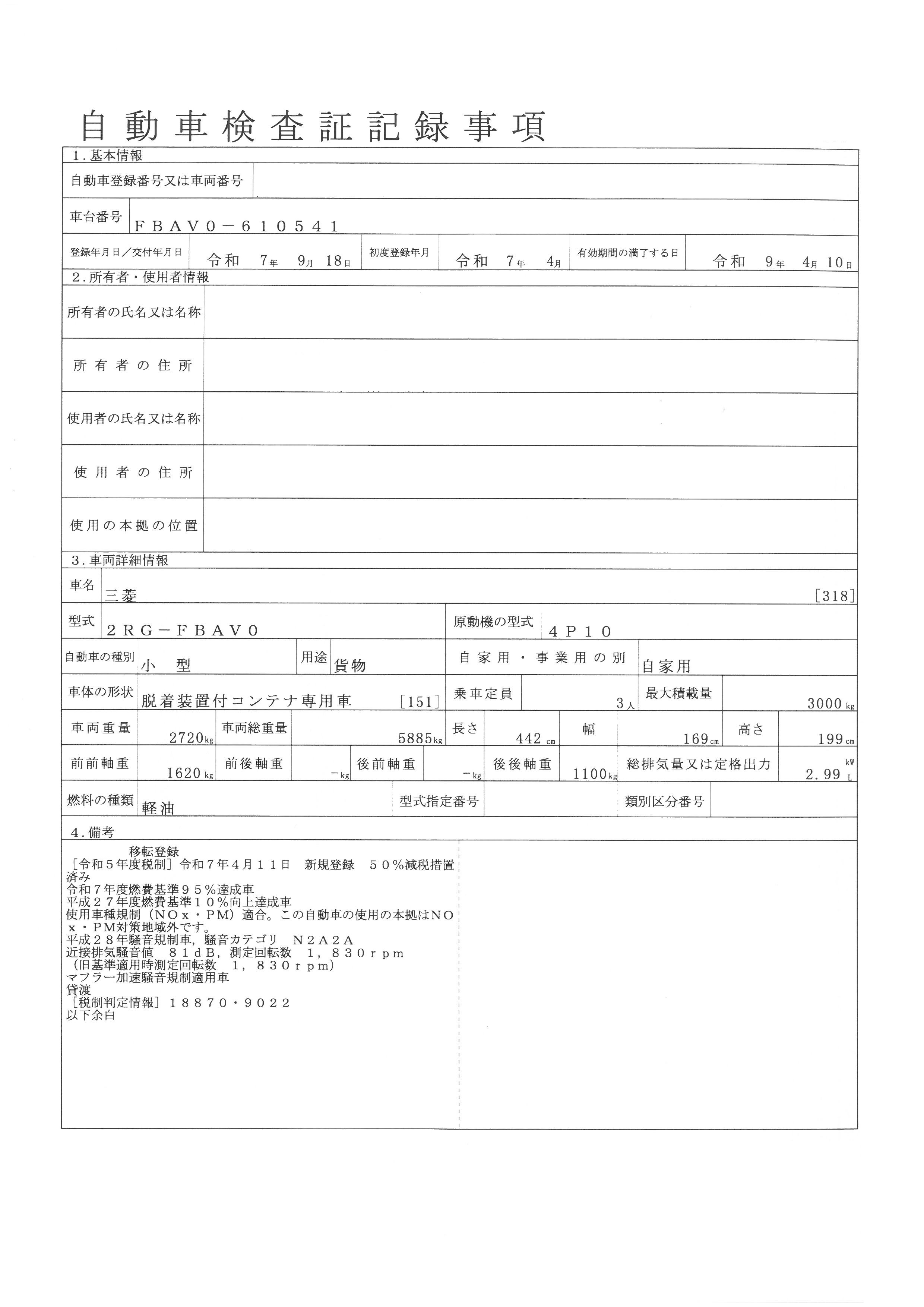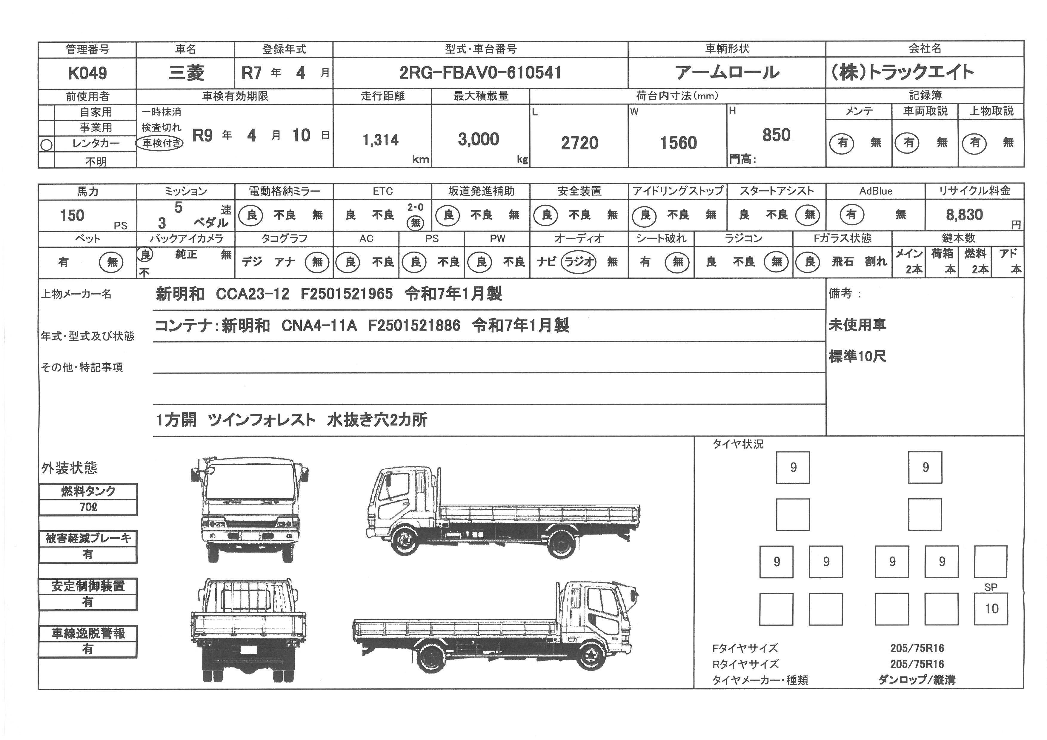 | 走行距離 | 1千km | リサイクル料 | 8830円 | 積載量 | 3000㎏ |