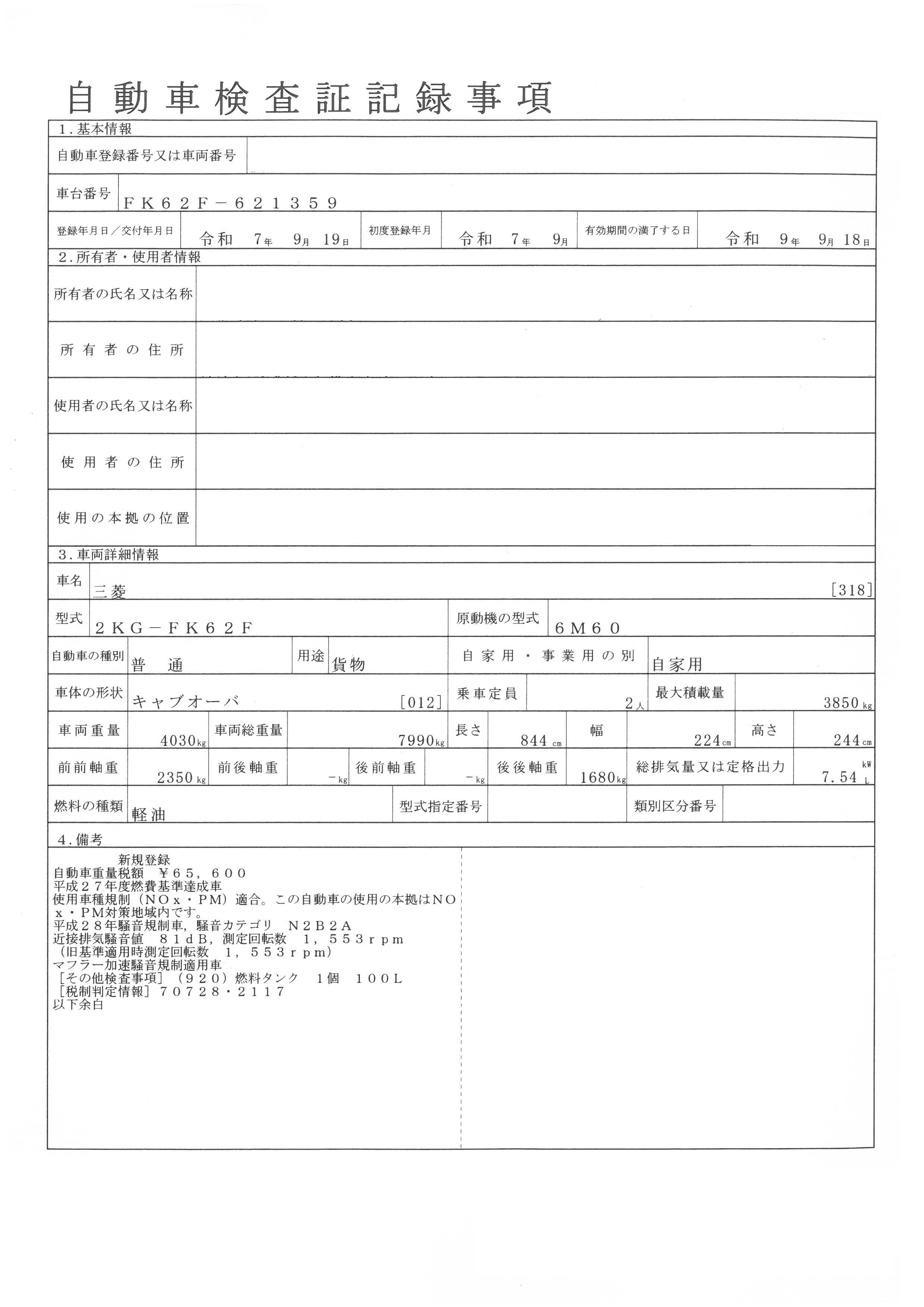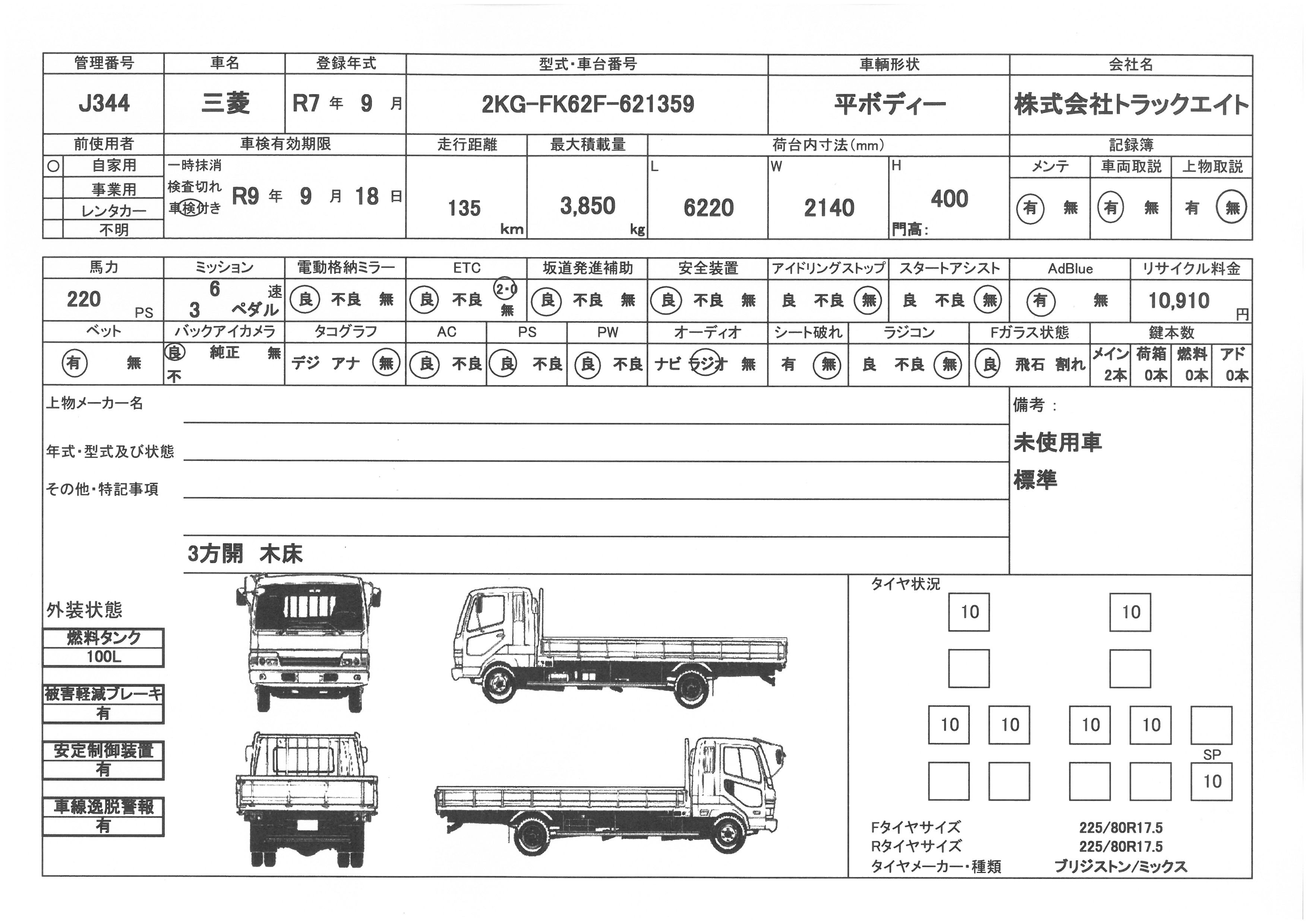 三菱 令和7年式 平ボディー 標準 3.85t積載 トラック情報 平ボディ車J344 by 鈴木英治. 売約済み 車両情報 問合せ番号 J344 [八千代在庫] メーカー 三菱 形状 平ボディー 初年度登録 令和7年9月 型式 2KG-FK62F 車検期限 令和9年9月18日 走行距離 1千km リサイクル料 10910円 積載量 3850㎏ 馬力 220PS ミッション 6速 エンジン型式 6M60 上物 上物形式 荷台寸法 6.22×2.14×0.40 ボディー仕様 木床 3方開 セールスポイント 未使用車 標準 L6220 木製煽り3方開 車検証 状態表