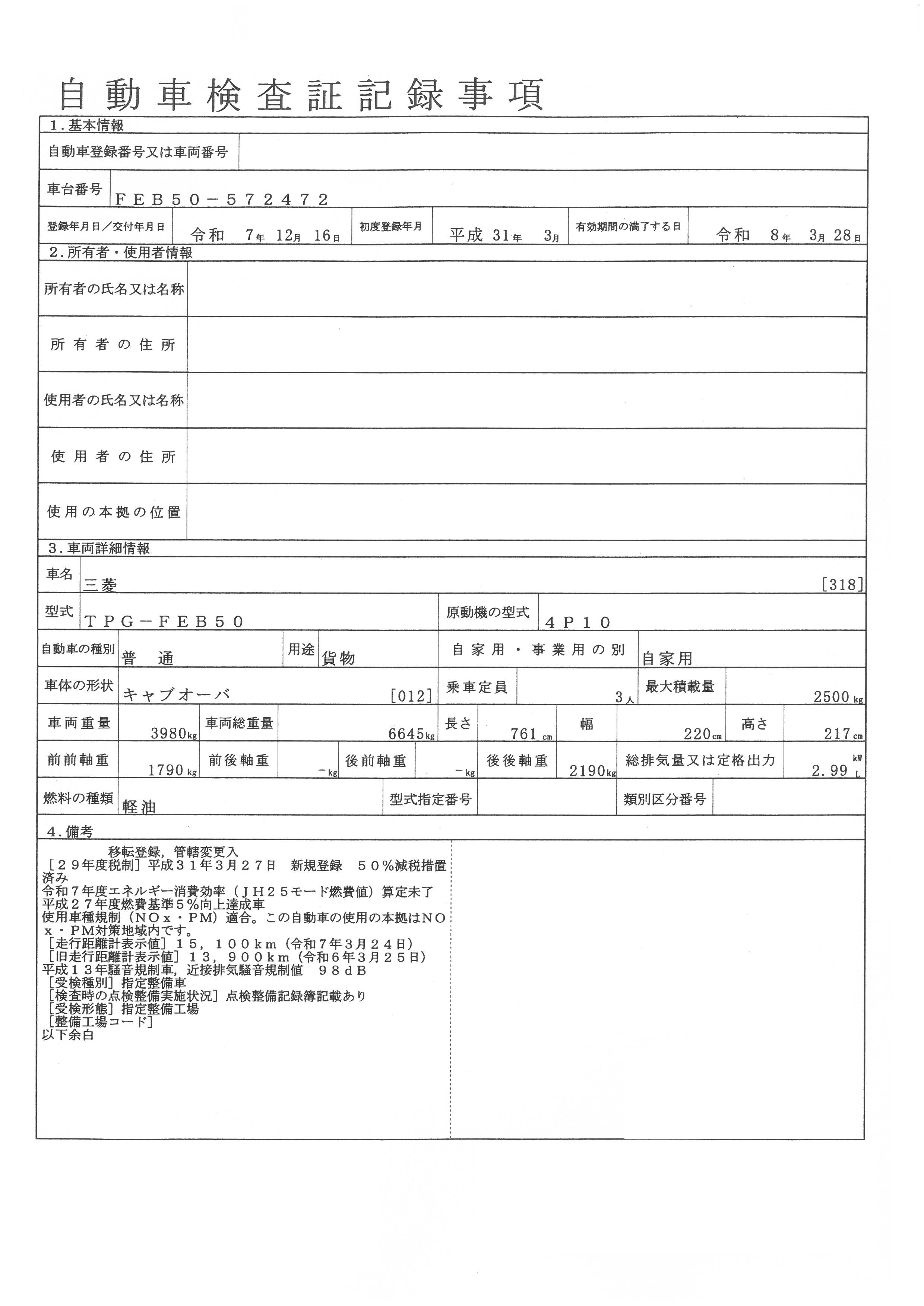 | 初年度登録 | 平成31年3月 | 型式 | TPG-FEB50 | 車検期限 | 令和8年3月28日 |