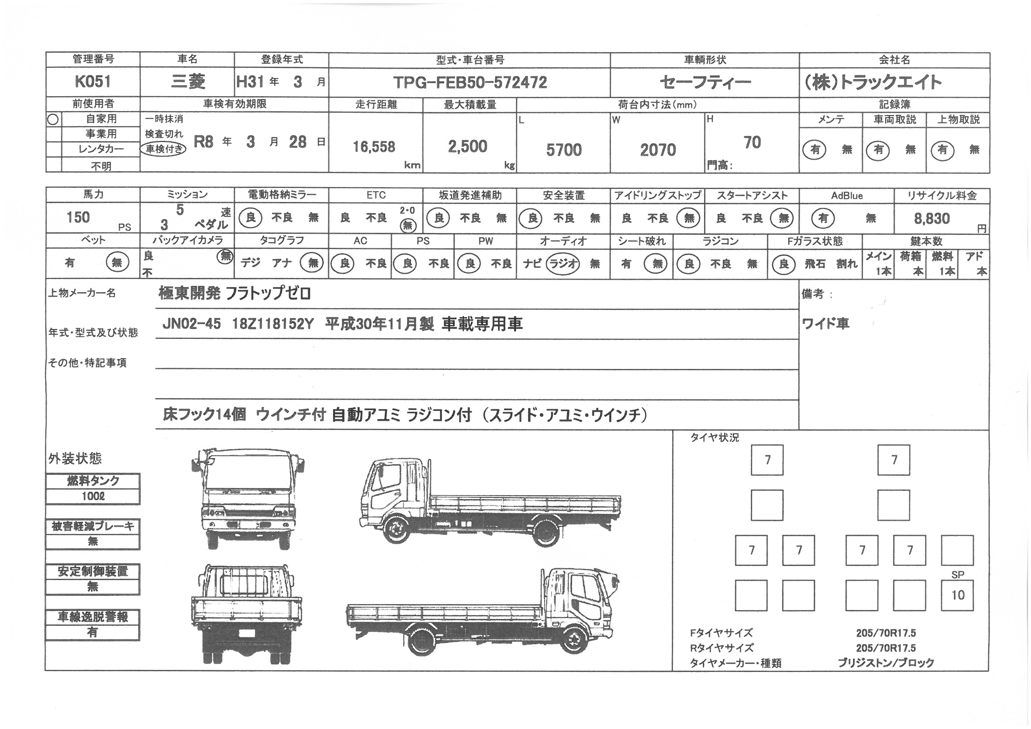| 上物 | 極東開発 | 上物形式 | JN02-45 | 荷台寸法 | 5.70×2.07×0.07 |