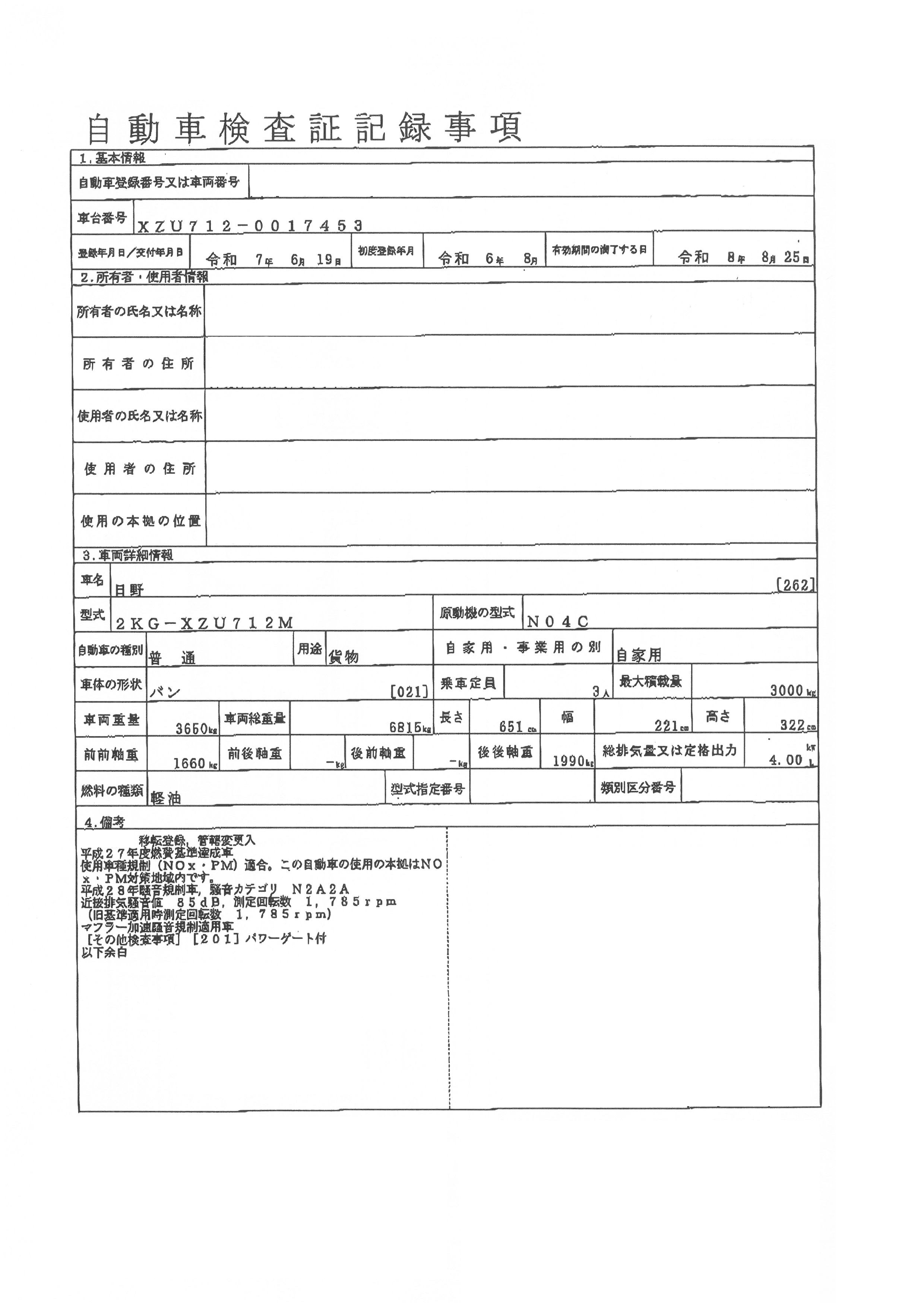| 初年度登録 | 令和6年8月 | 型式 | 2KG-XZU712M | 車検期限 | 令和8年8月25日 |