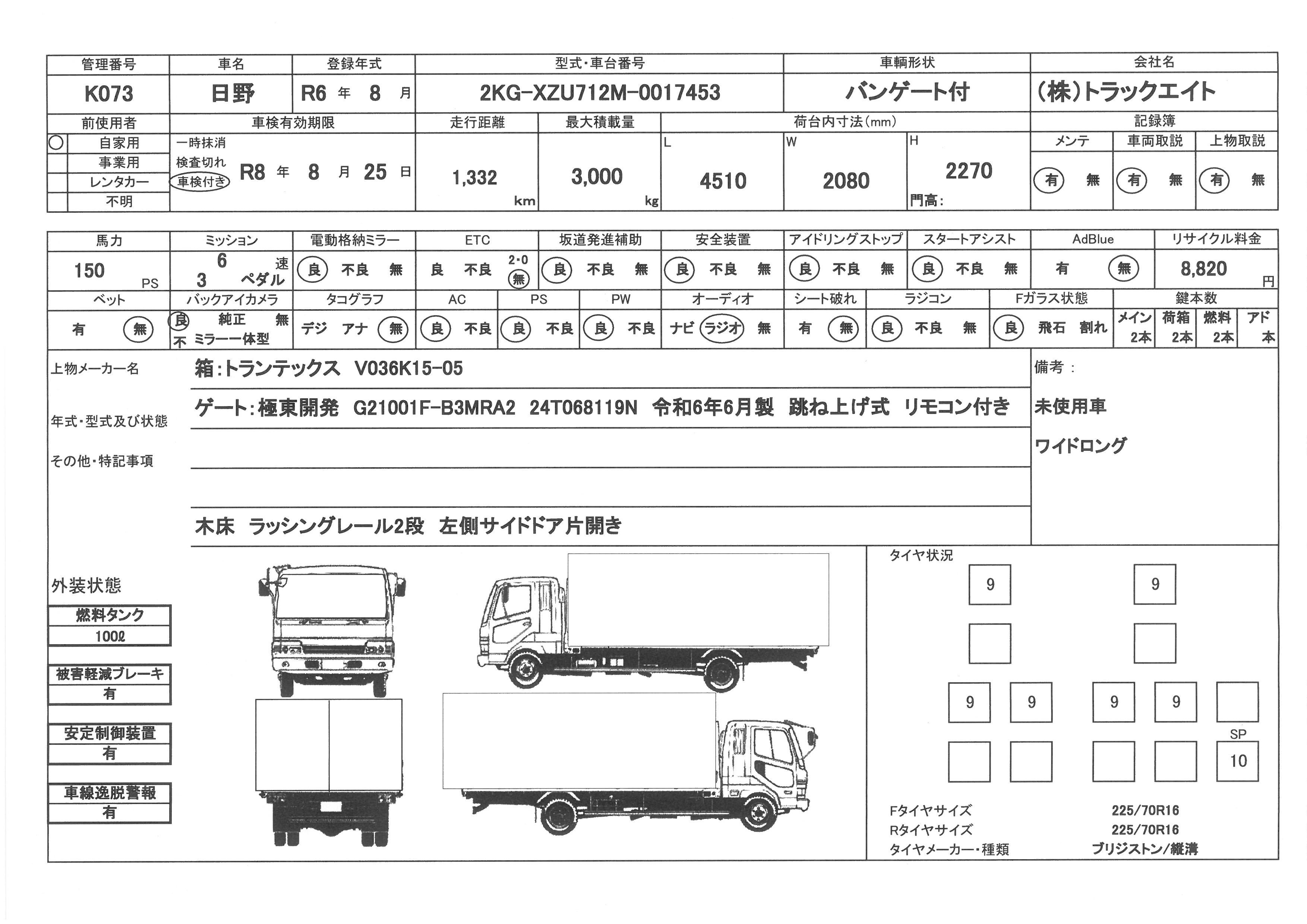 | ボディー仕様 | 木床 ラッシングレール2段 左側サイドドア片開き 極東製跳ね上げ式パワーゲート(ラジコン付) | ||||