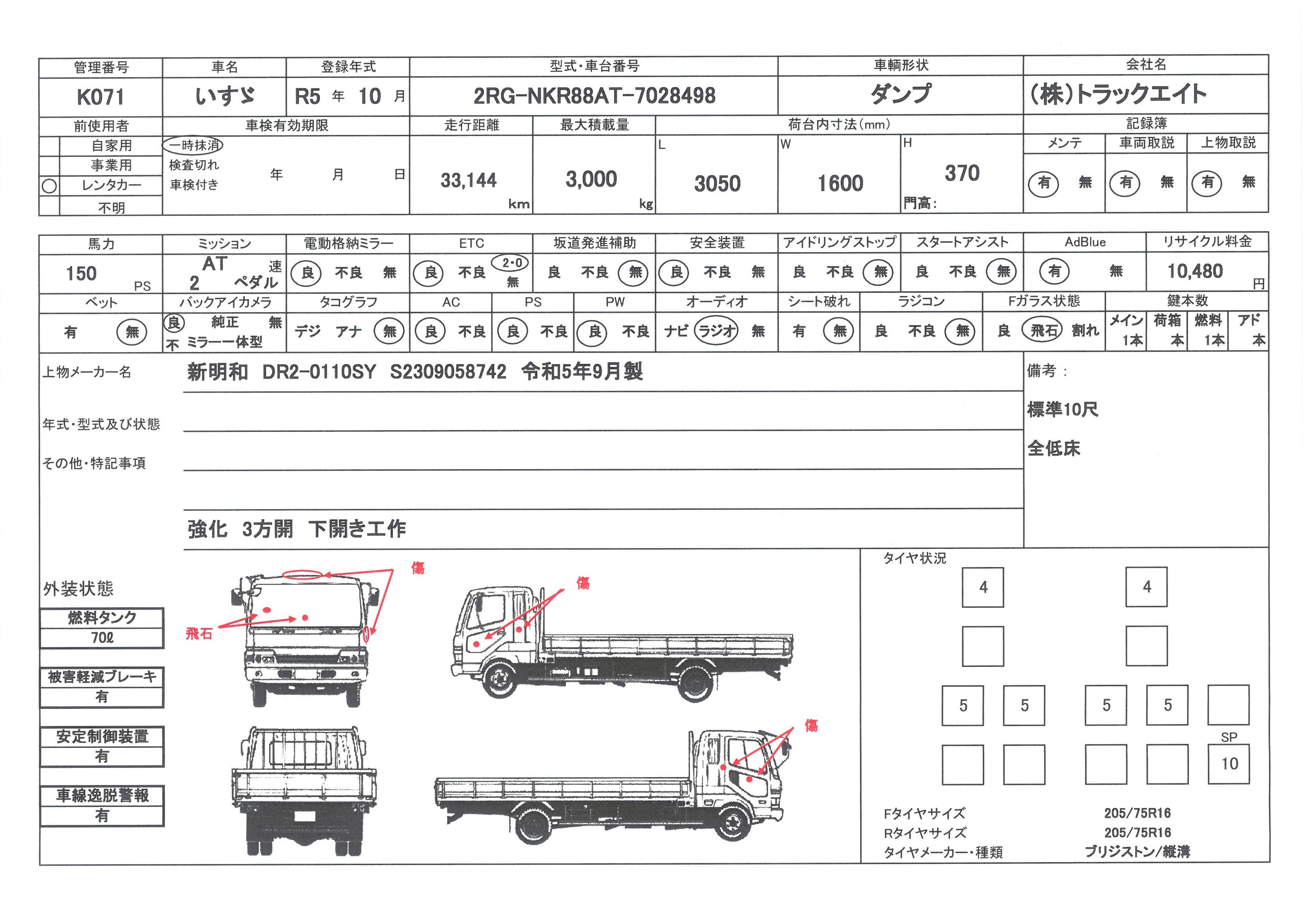 いすゞ 令和5年式 ダンプ 新明和 ISIM 3t積載 トラック情報 ダンプ車・ミキサー車K071 by 鈴木英治. 車両情報 問合せ番号 K071 [船橋在庫] メーカー いすゞ 形状 ダンプ 初年度登録 令和5年10月 型式 2RG-NKR88AT 車検期限 一時抹消 走行距離 33千km リサイクル料 10480円 積載量 3000㎏ 馬力 150PS ミッション ISIM エンジン型式 4JZ1 上物 新明和 上物形式 DR2-0110SY 荷台寸法 3.05×1.60×0.37 ボディー仕様 強化 3方開 リヤロックピン セールスポイント 新明和 土砂ダンプ 3方開 強化 ISIM 全低床 3t積載 車検証 状態表