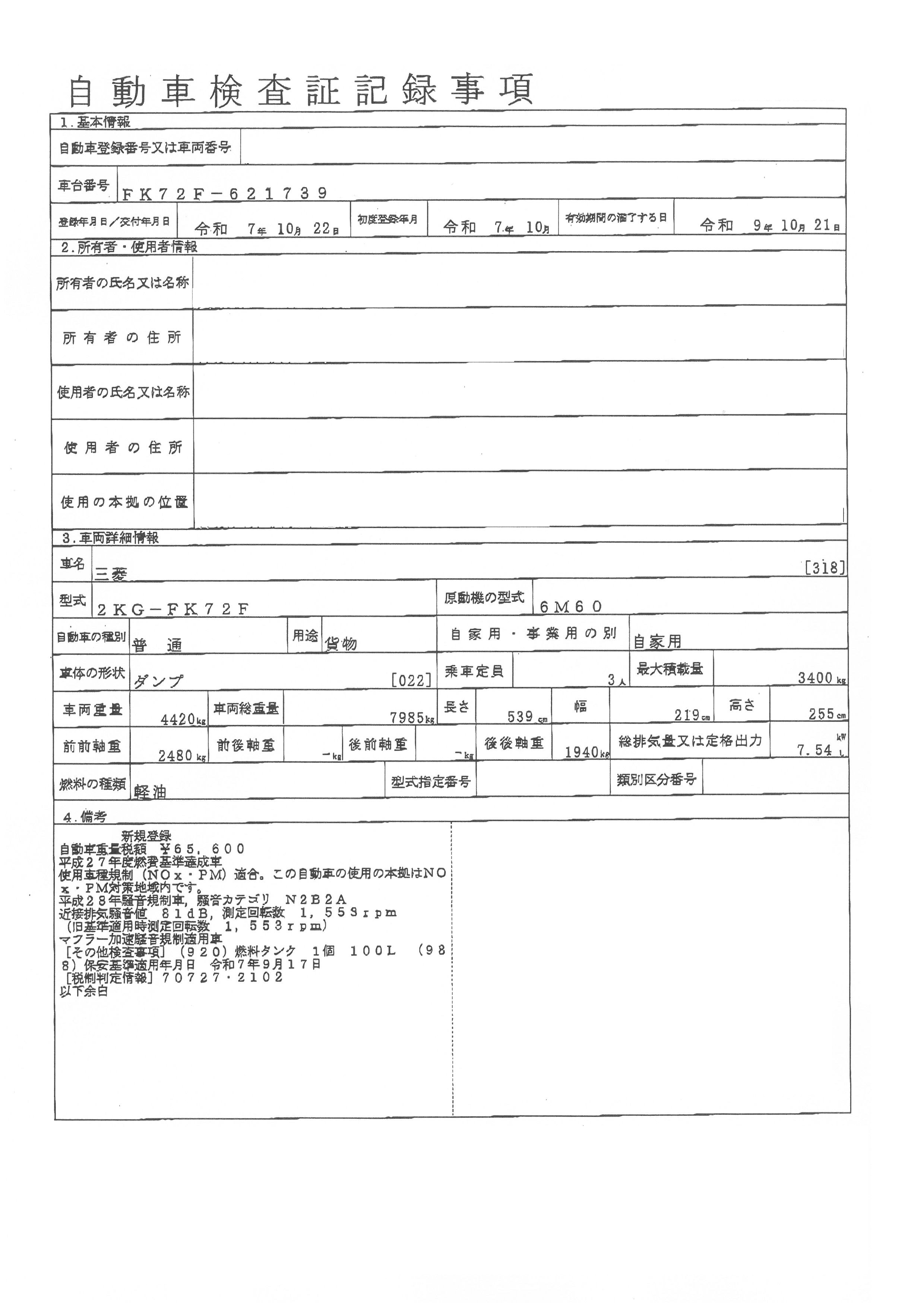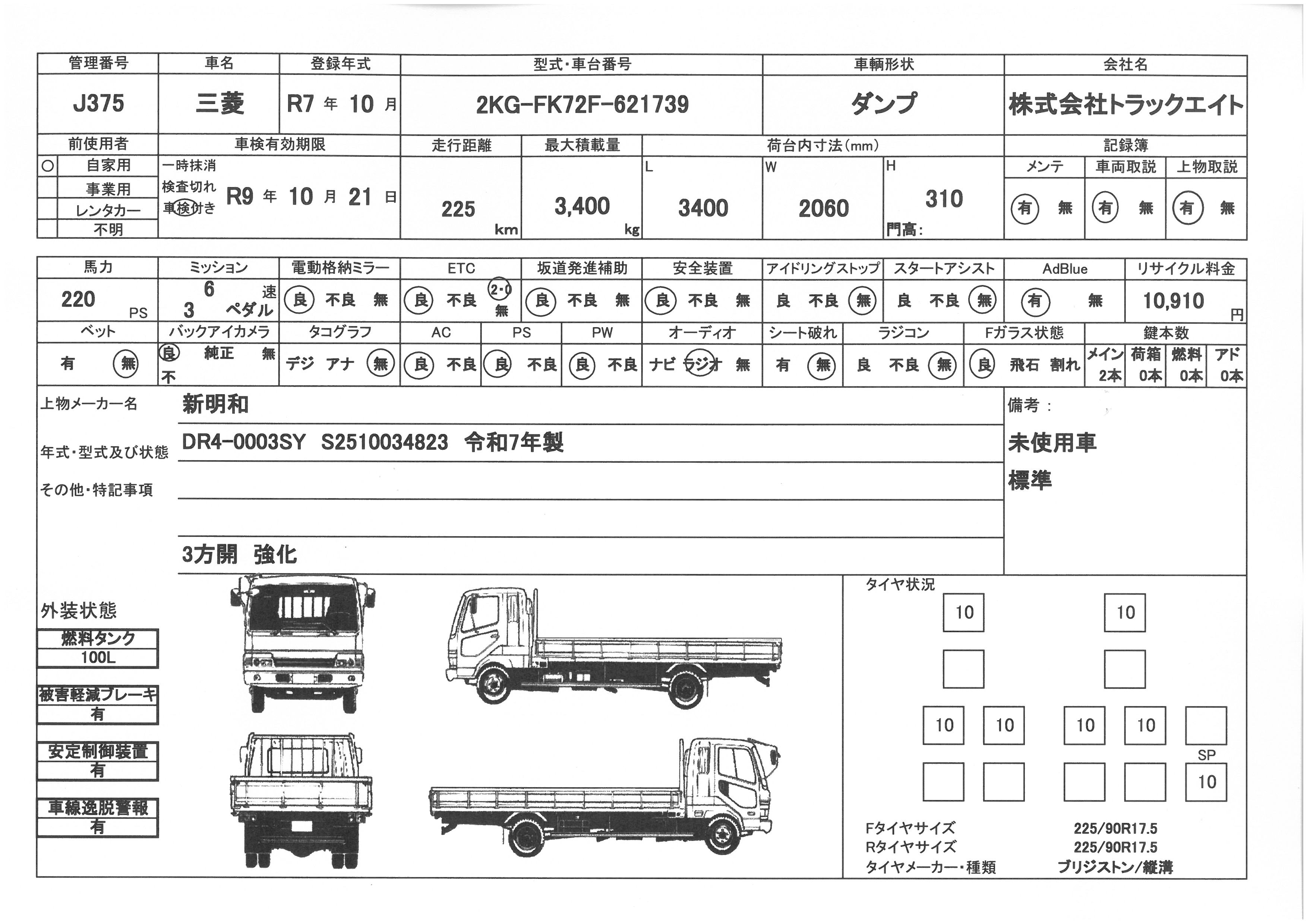 三菱 令和7年式 ダンプ 新明和 3.4t積載 トラック情報 ダンプ車・ミキサー車J375 by 鈴木英治. 車両情報 問合せ番号 J375 [八千代在庫] メーカー 三菱 形状 ダンプ 初年度登録 令和7年10月 型式 2KG-FK72F 車検期限 令和9年10月21日 走行距離 1千km リサイクル料 10910円 積載量 3400㎏ 馬力 220PS ミッション 6速 エンジン型式 6M60 上物 新明和 上物形式 DR4-0003SY 荷台寸法 3.40×2.06×0.31 ボディー仕様 3方開 強化 セールスポイント ☆未使用車 新明和 土砂ダンプ 3方開 強化 車検証 状態表