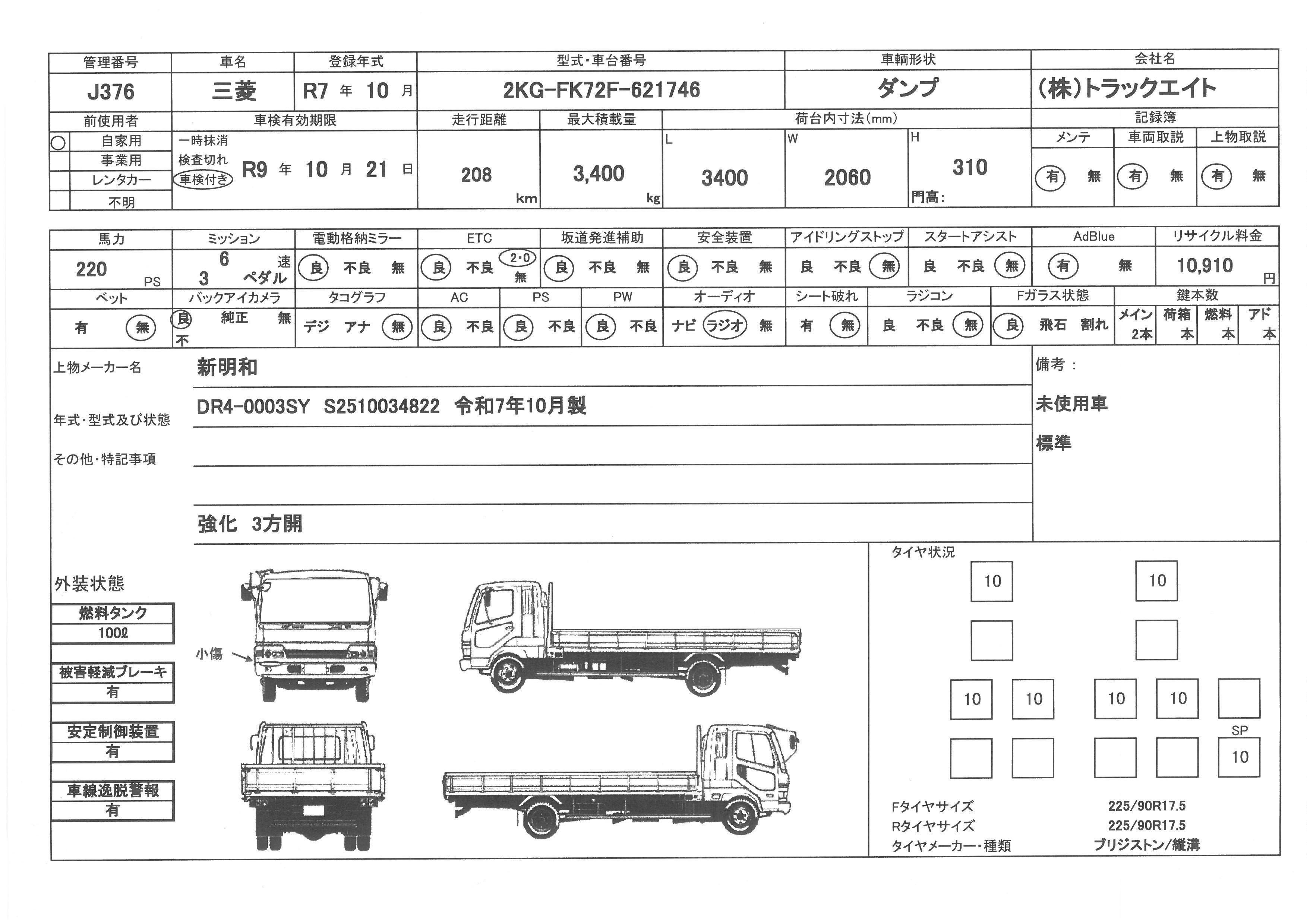 走行距離 1千km リサイクル料 10910円 積載量 3400㎏