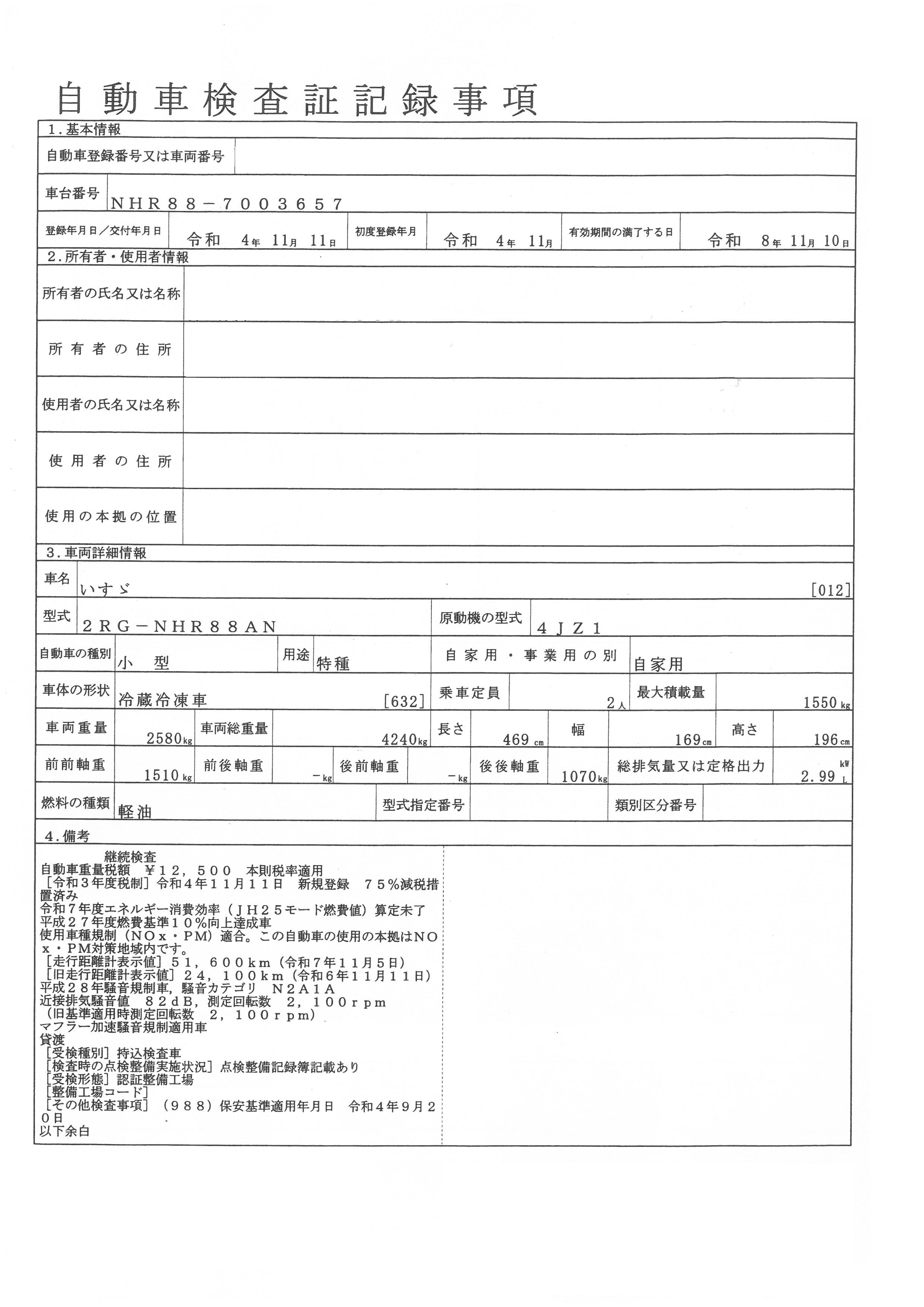 | 初年度登録 | 令和4年11月 | 型式 | 2RG-NHR88AN | 車検期限 | 令和8年11月10日 |