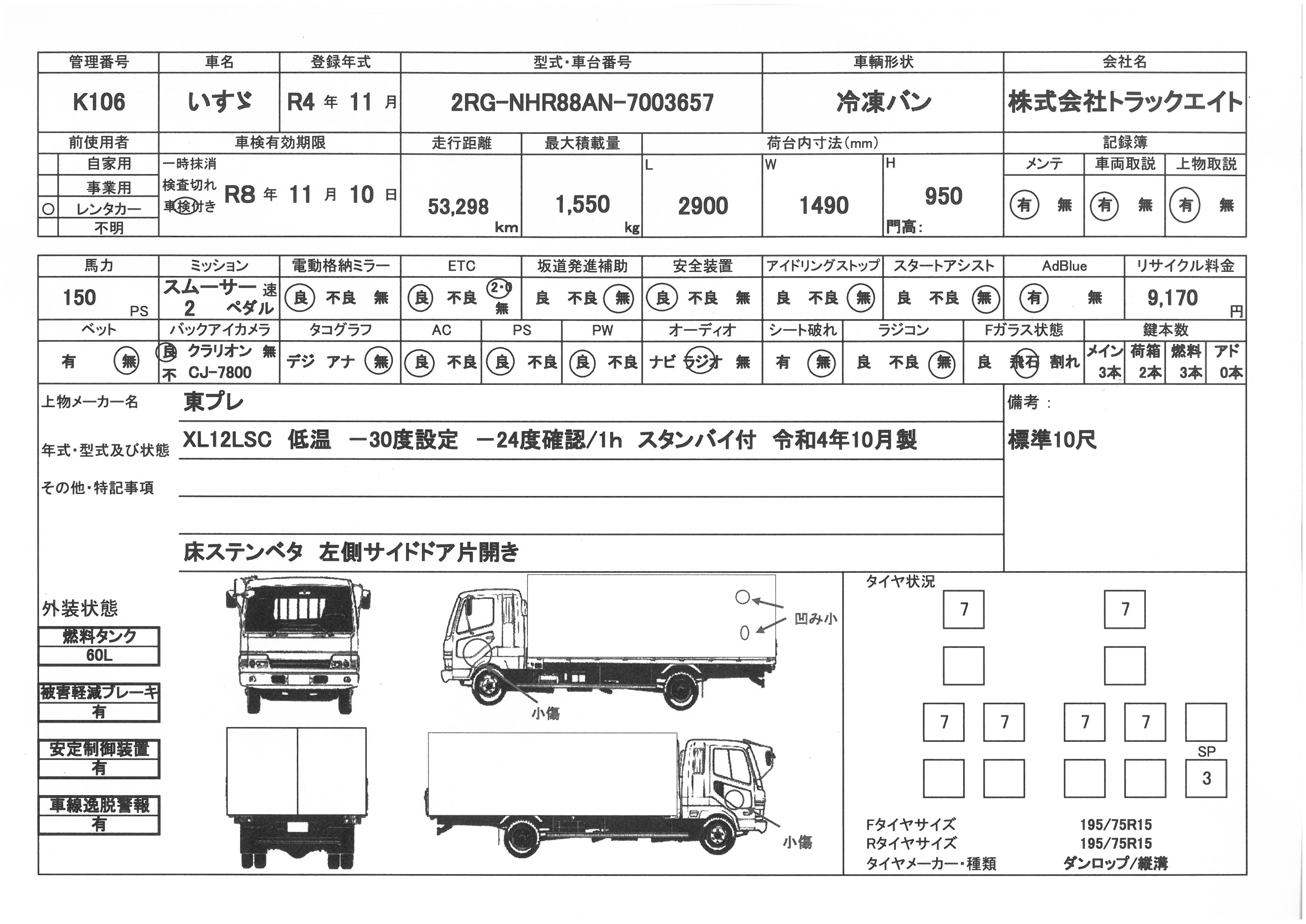 | 問合せ番号 | K106 [八千代在庫] | メーカー | いすゞ | 形状 | 冷凍車 |