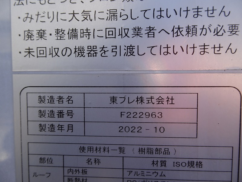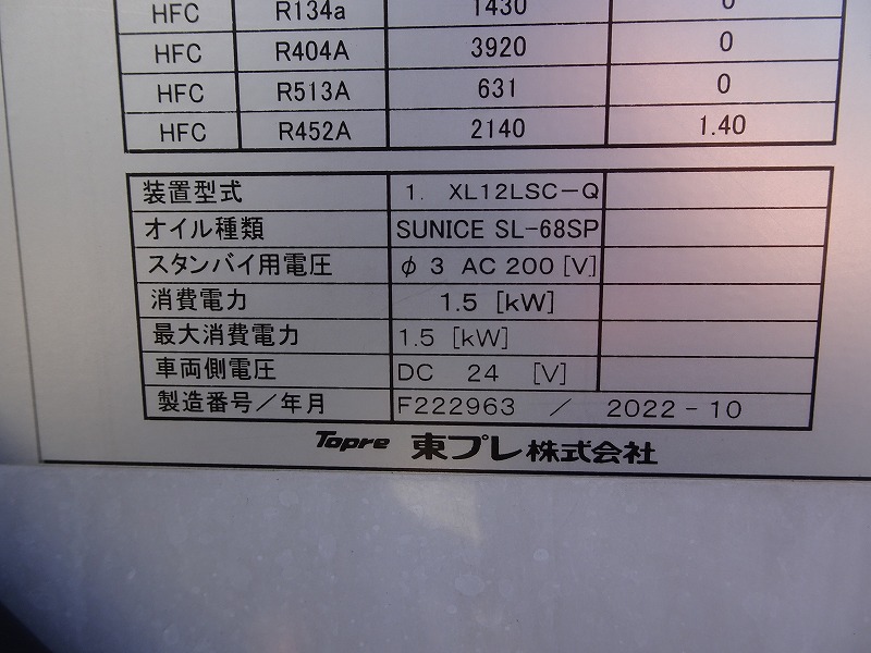 | ボディー仕様 | 東プレXL12LSC 低温 -30度設定 -24度確認/1h スタンバイ付 床ステンベタ 左側サイドドア片開き | ||||