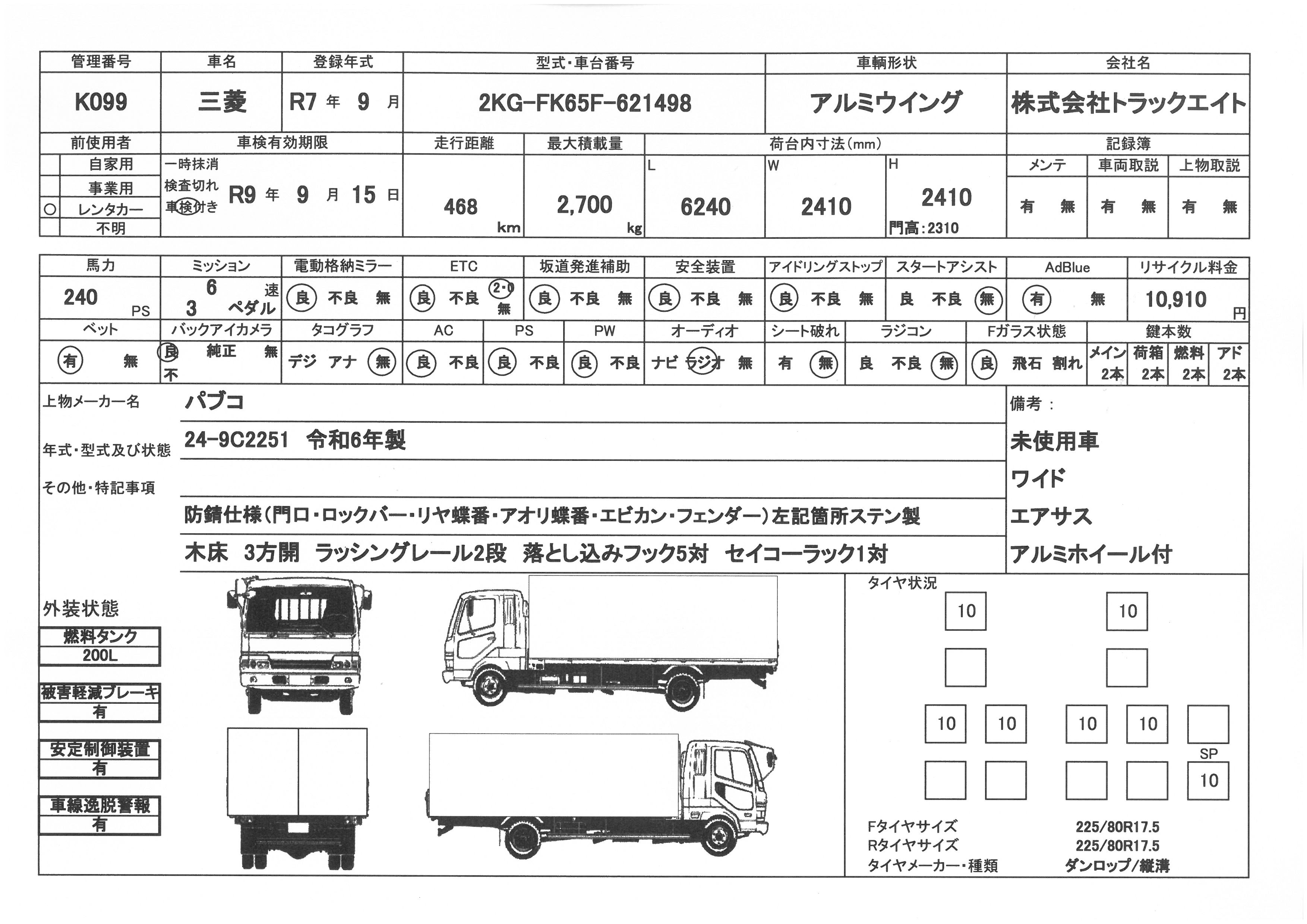 | 上物 | パブコ | 上物形式 | 24-9C2251 | 荷台寸法 | 6.24×2.41×2.41 |