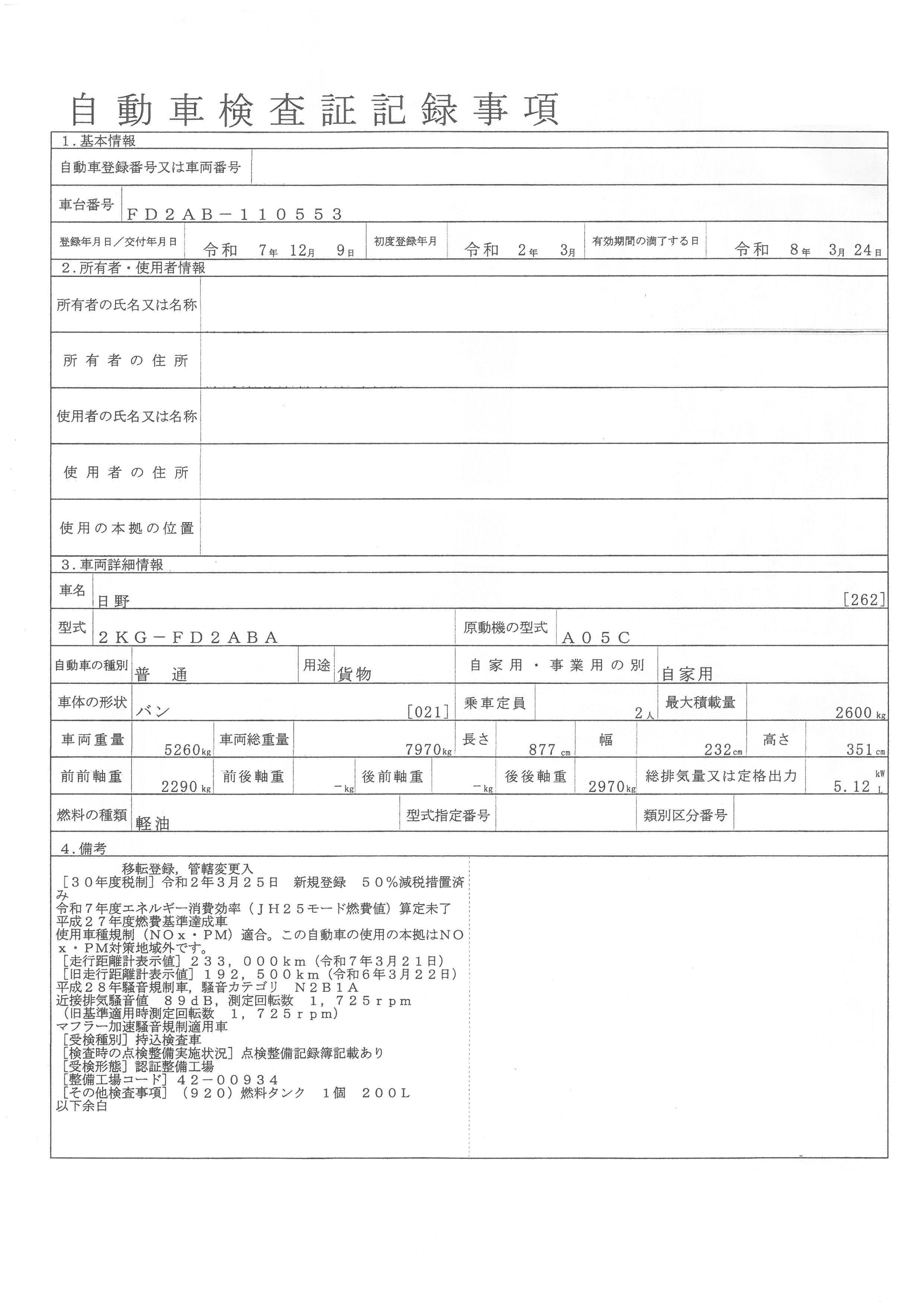 | 初年度登録 | 令和2年3月 | 型式 | 2KG-FD2ABA | 車検期限 | 一時抹消 |
