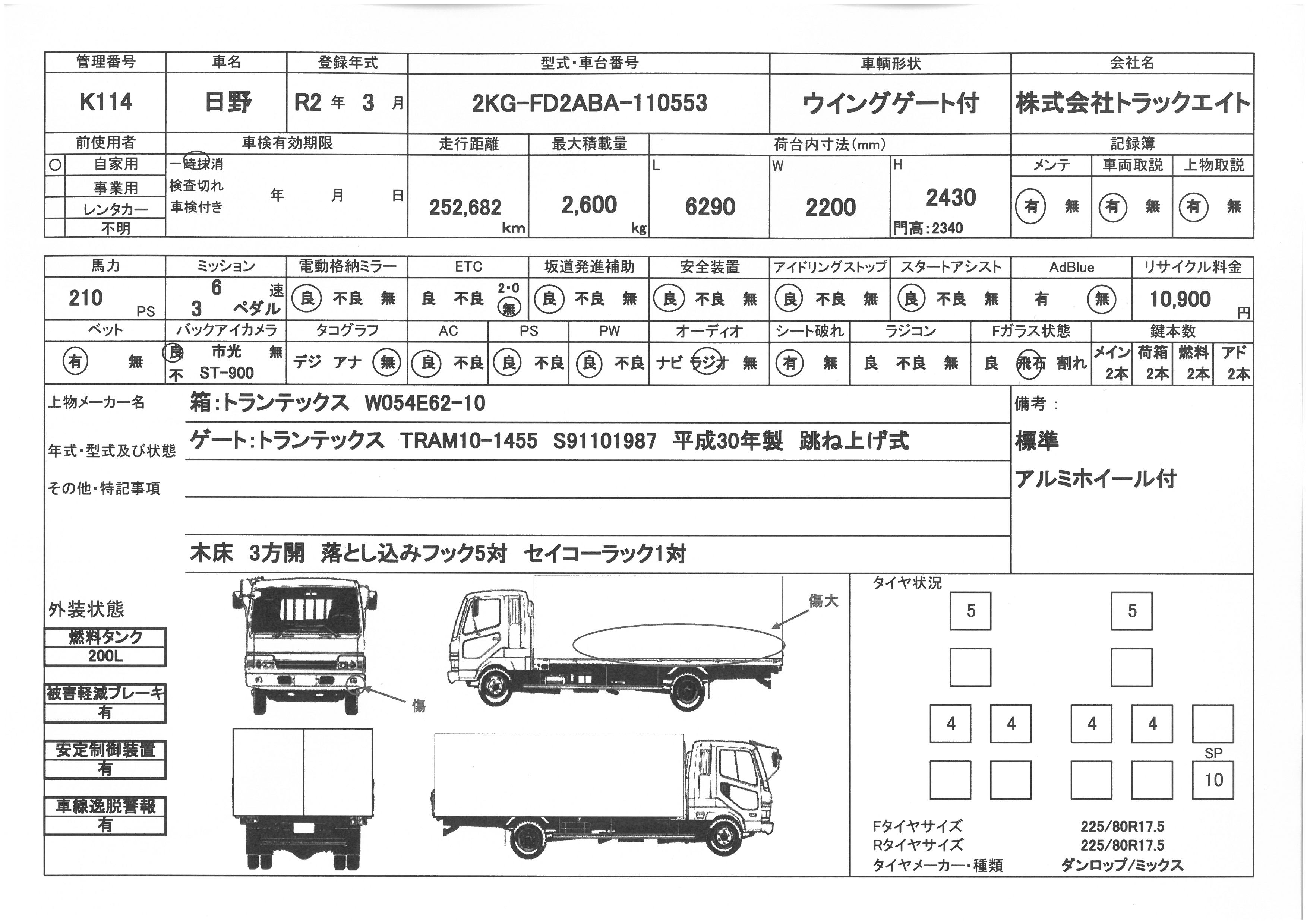 | 問合せ番号 | K114 [八千代在庫] | メーカー | 日野 | 形状 | ウイングゲート付 |