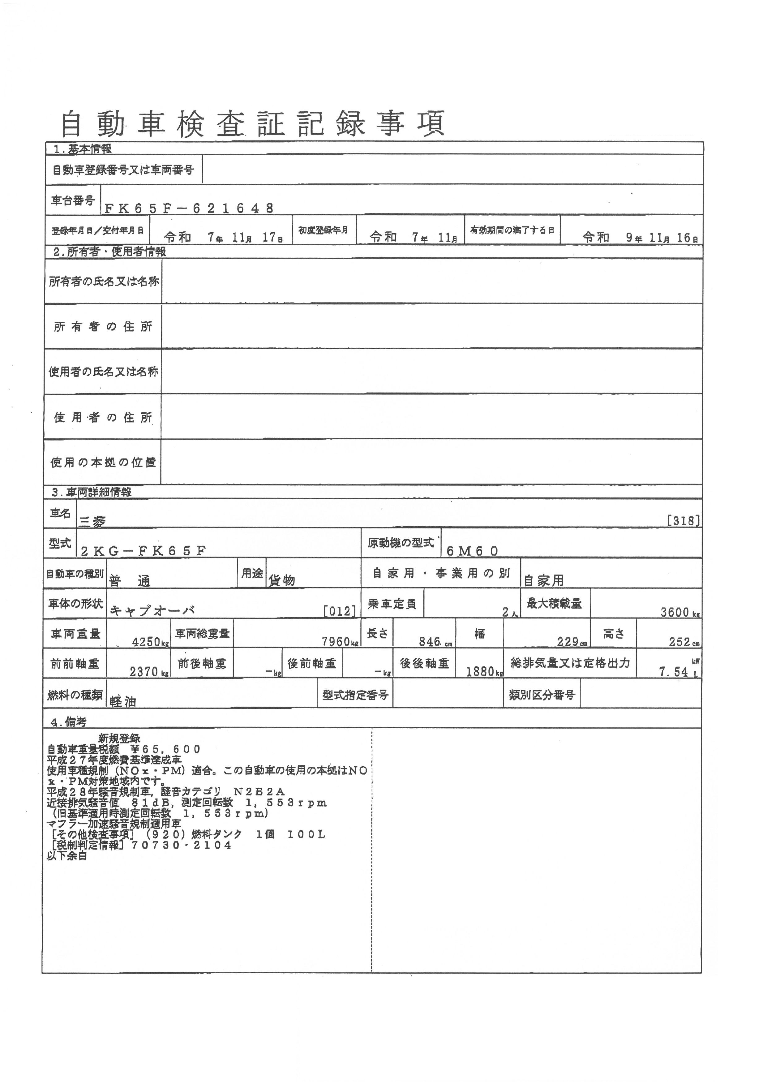 三菱 令和7年式 アルミ平 標準 PTO付 3.6t積載 トラック情報 平ボディ車K021 by 鈴木英治. 車両情報 問合せ番号 K021 [八千代在庫] メーカー 三菱 形状 平アルミブロック 初年度登録 令和7年11月 型式 2KG-FK65F 車検期限 令和9年11月16日 走行距離 1千km リサイクル料 10910円 積載量 3600㎏ 馬力 220PS ミッション 6速 エンジン型式 6M60 上物 上物形式 荷台寸法 6.21×2.17×0.69 ボディー仕様 アルミ3方開 木床 セールスポイント 未使用車 標準 エアサス L6210 アルミ3方開 PTO付 車検証 状態表