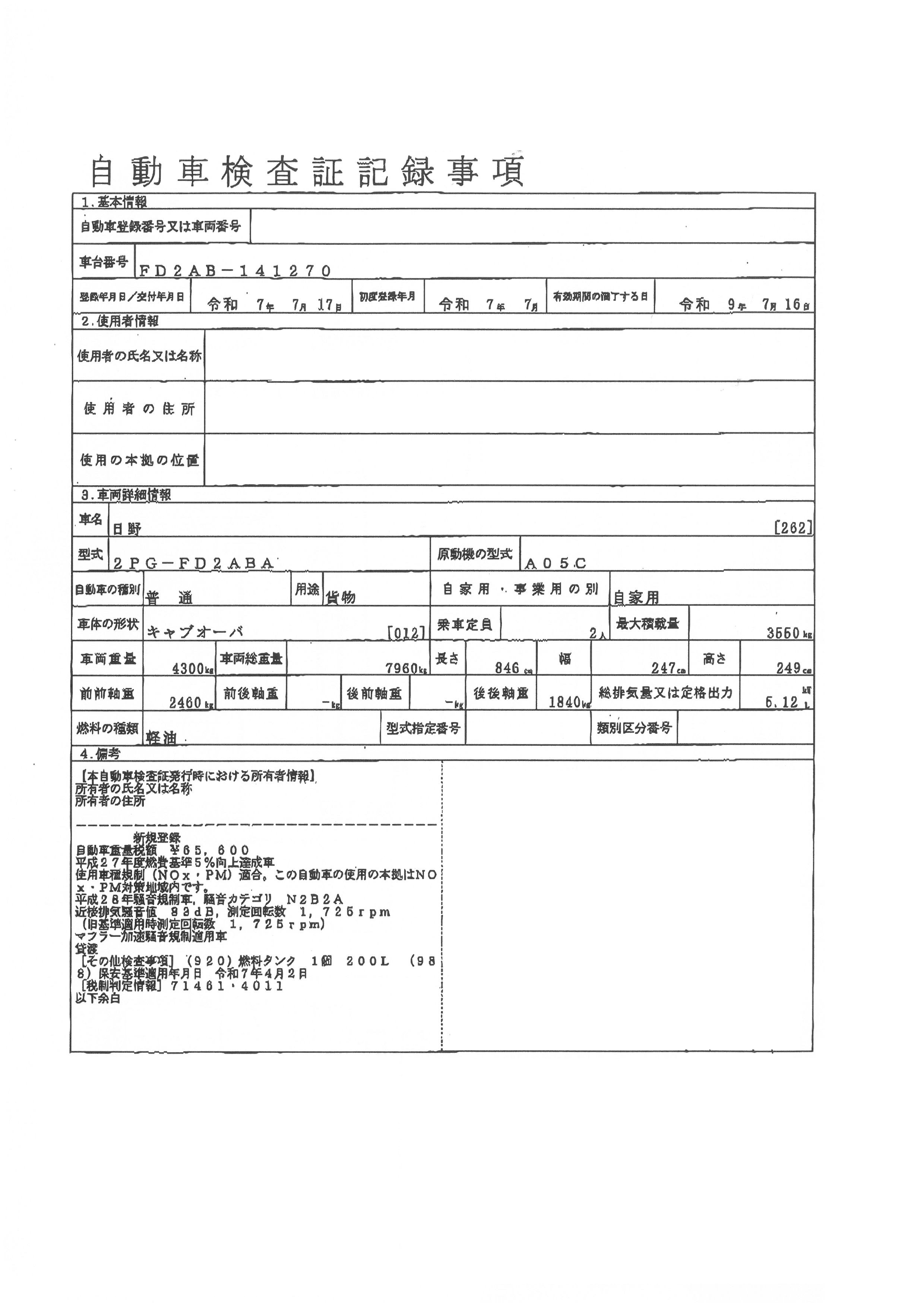 | 初年度登録 | 令和7年7月 | 型式 | 2PG-FD2ABA | 車検期限 | 令和9年7月16日 |
