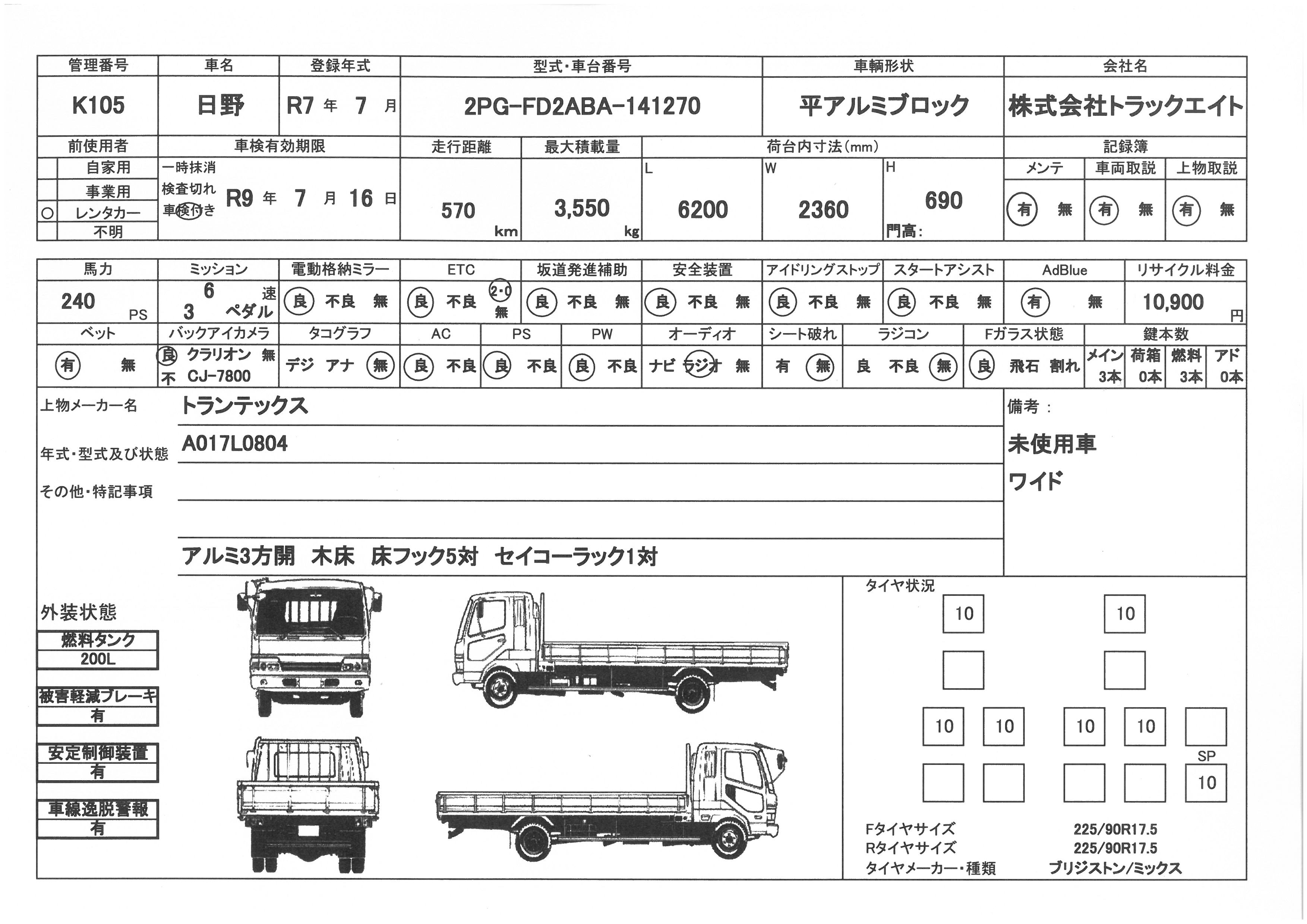 | 上物 | トランテックス | 上物形式 | A017L0804 | 荷台寸法 | 6.20×2.36×0.69 |