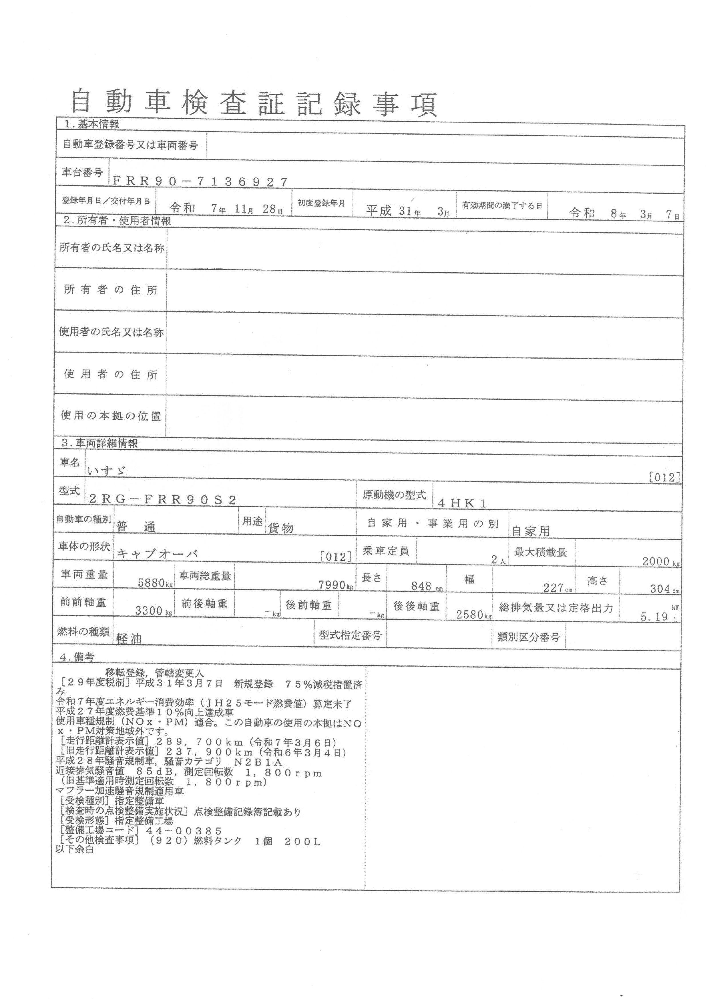 | 初年度登録 | 平成31年3月 | 型式 | 2RG-FRR90S2 | 車検期限 | 令和8年3月7日 |