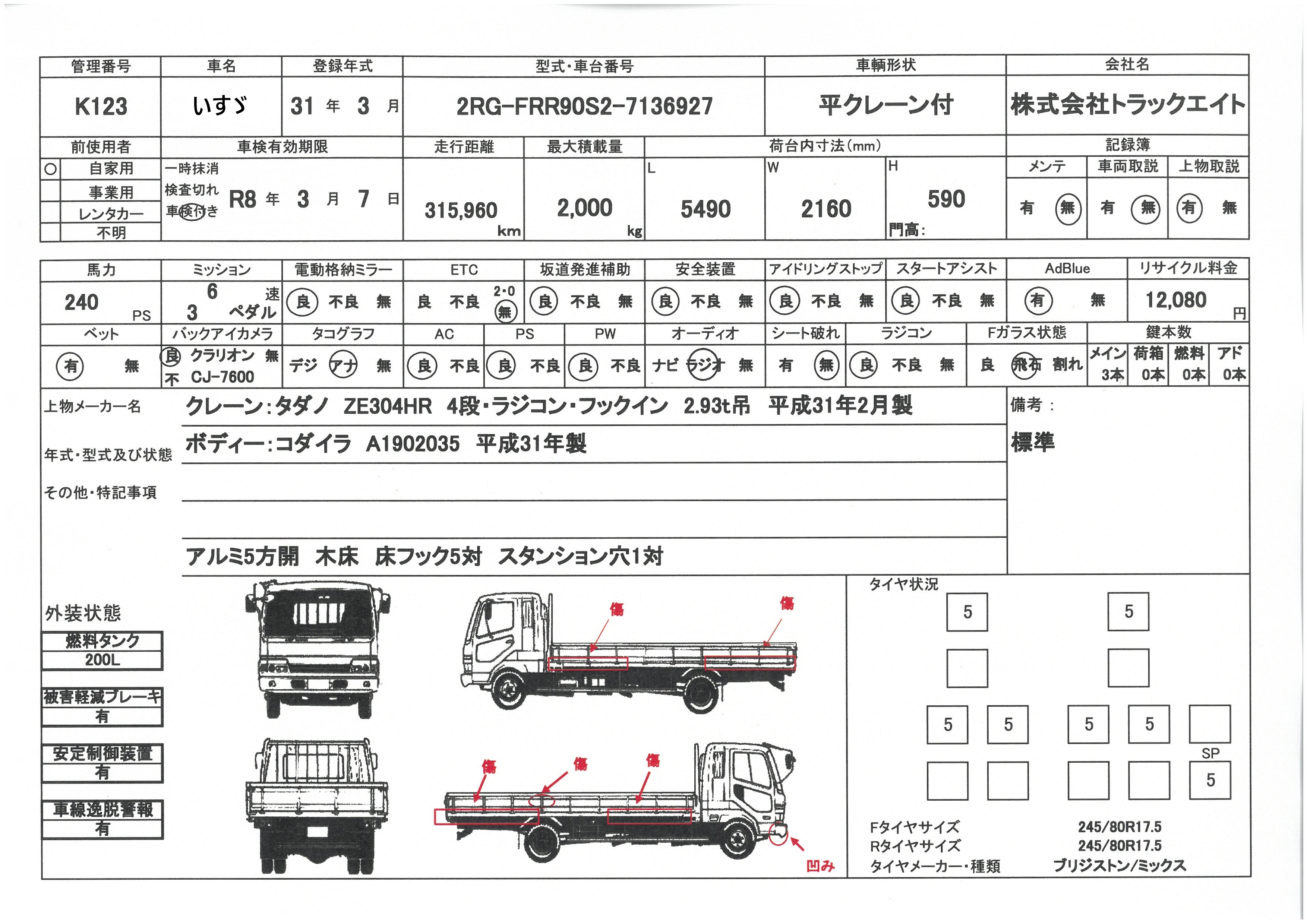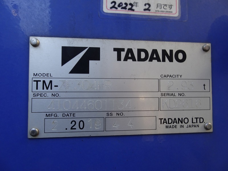 | 上物 | タダノ | 上物形式 | ZE304HR | 荷台寸法 | 5.49×2.16×0.59 |