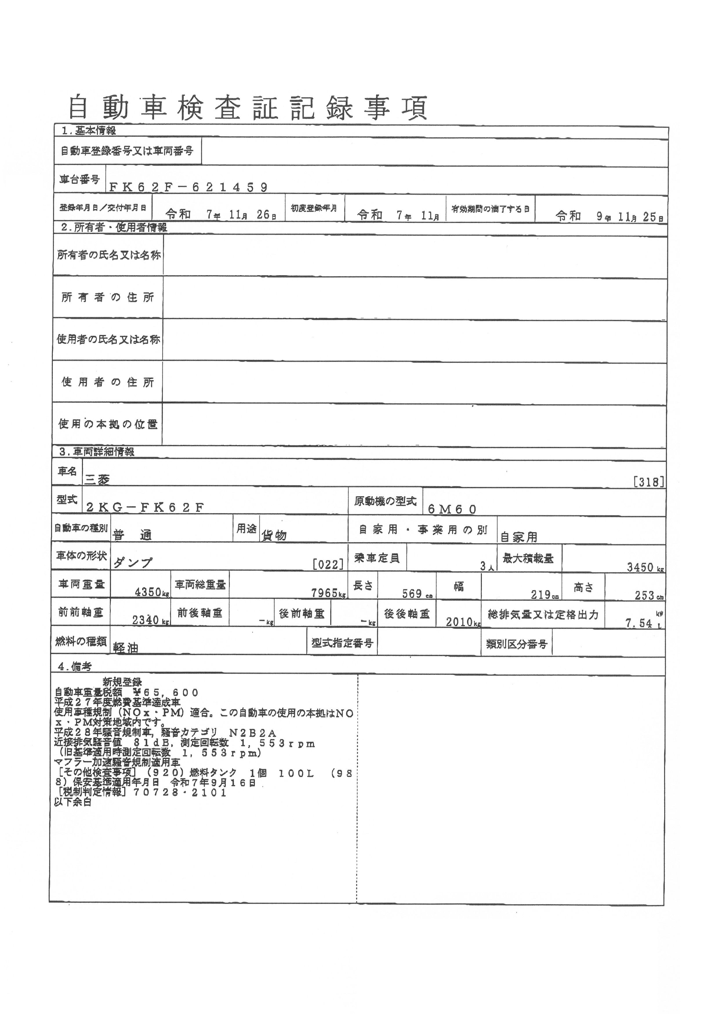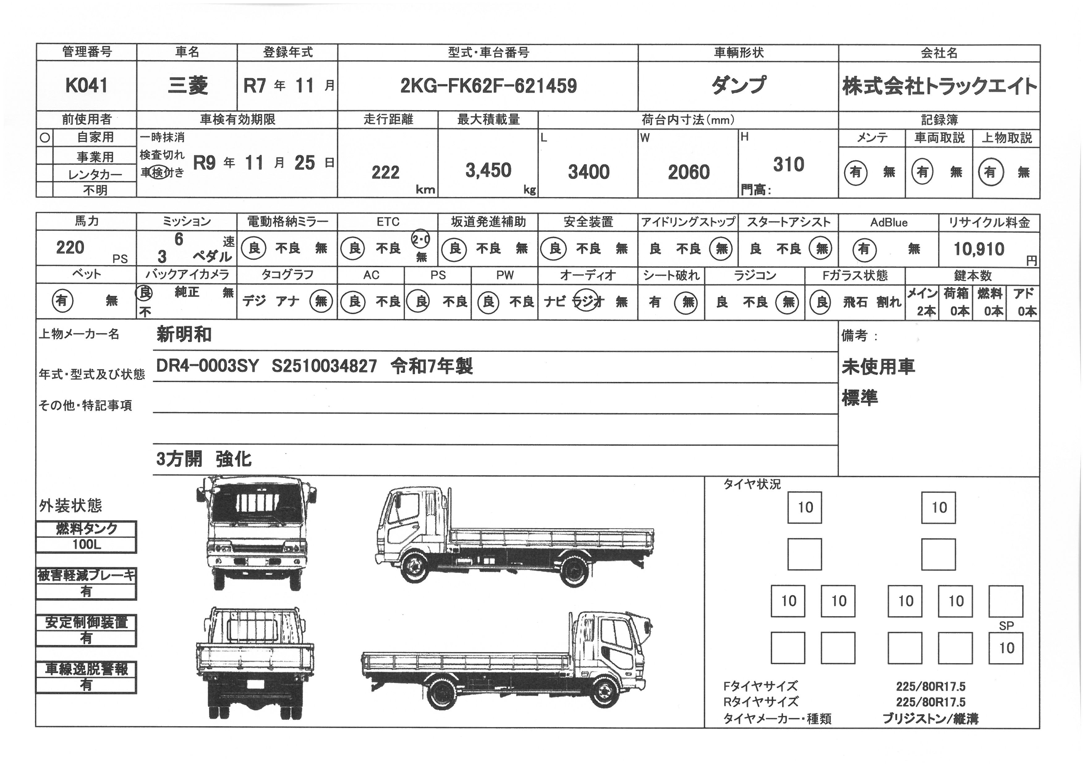 三菱 令和7年式 ダンプ ベッド付 新明和 3.45t積載 トラック情報 ダンプ車・ミキサー車K041 by 鈴木英治. 車両情報 問合せ番号 K041 [八千代在庫] メーカー 三菱 形状 ダンプ 初年度登録 令和7年11月 型式 2KG-FK62F 車検期限 令和9年11月25日 走行距離 1千km リサイクル料 10910円 積載量 3450㎏ 馬力 220PS ミッション 6速 エンジン型式 6M60 上物 新明和 上物形式 DR4-0003SY 荷台寸法 3.40×2.06×0.31 ボディー仕様 3方開 強化 セールスポイント 未使用車 新明和 土砂ダンプ 3方開 強化 車検証 状態表