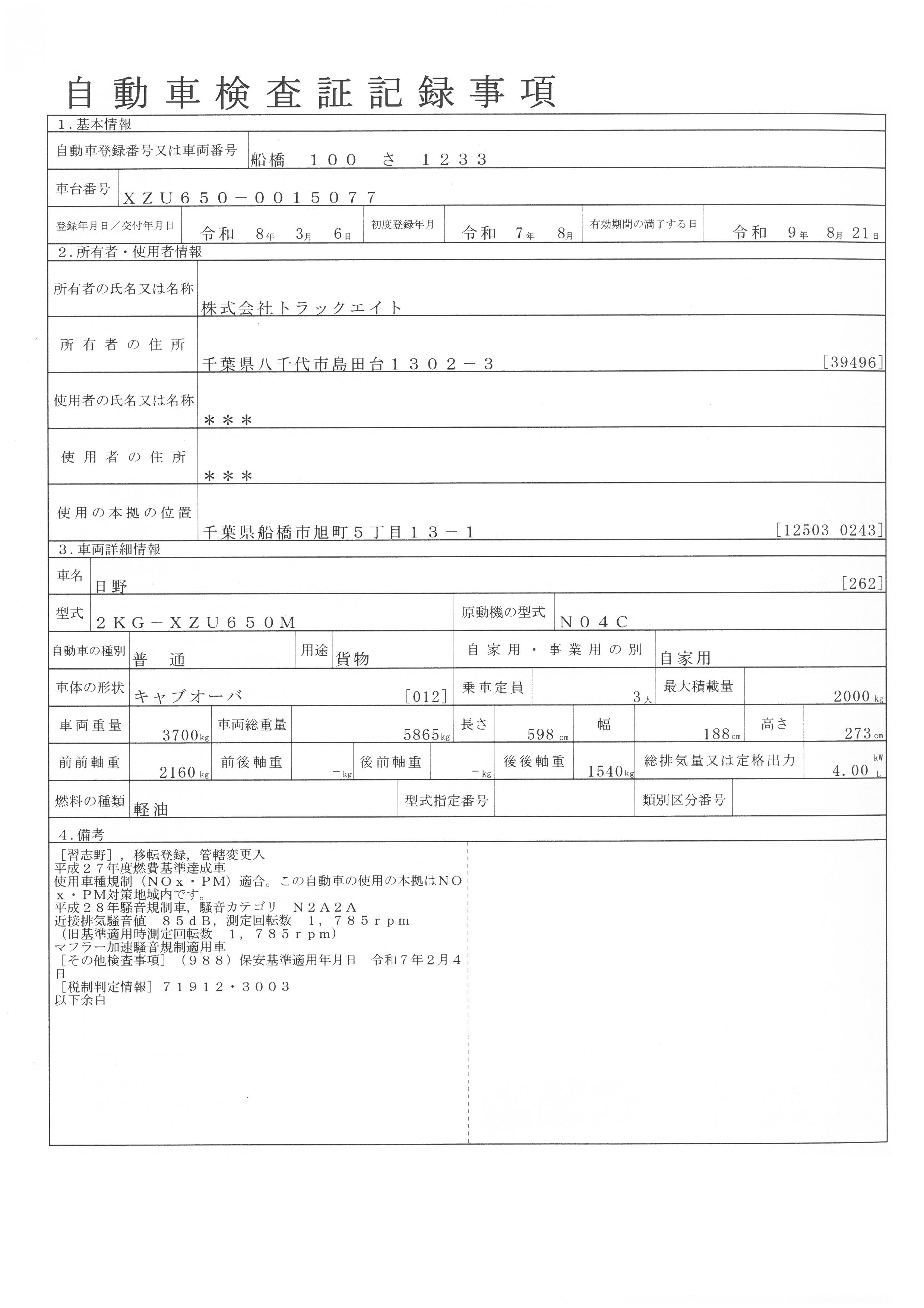 | 初年度登録 | 令和7年8月 | 型式 | 2KG-XZU650M | 車検期限 | 令和9年8月21日 |