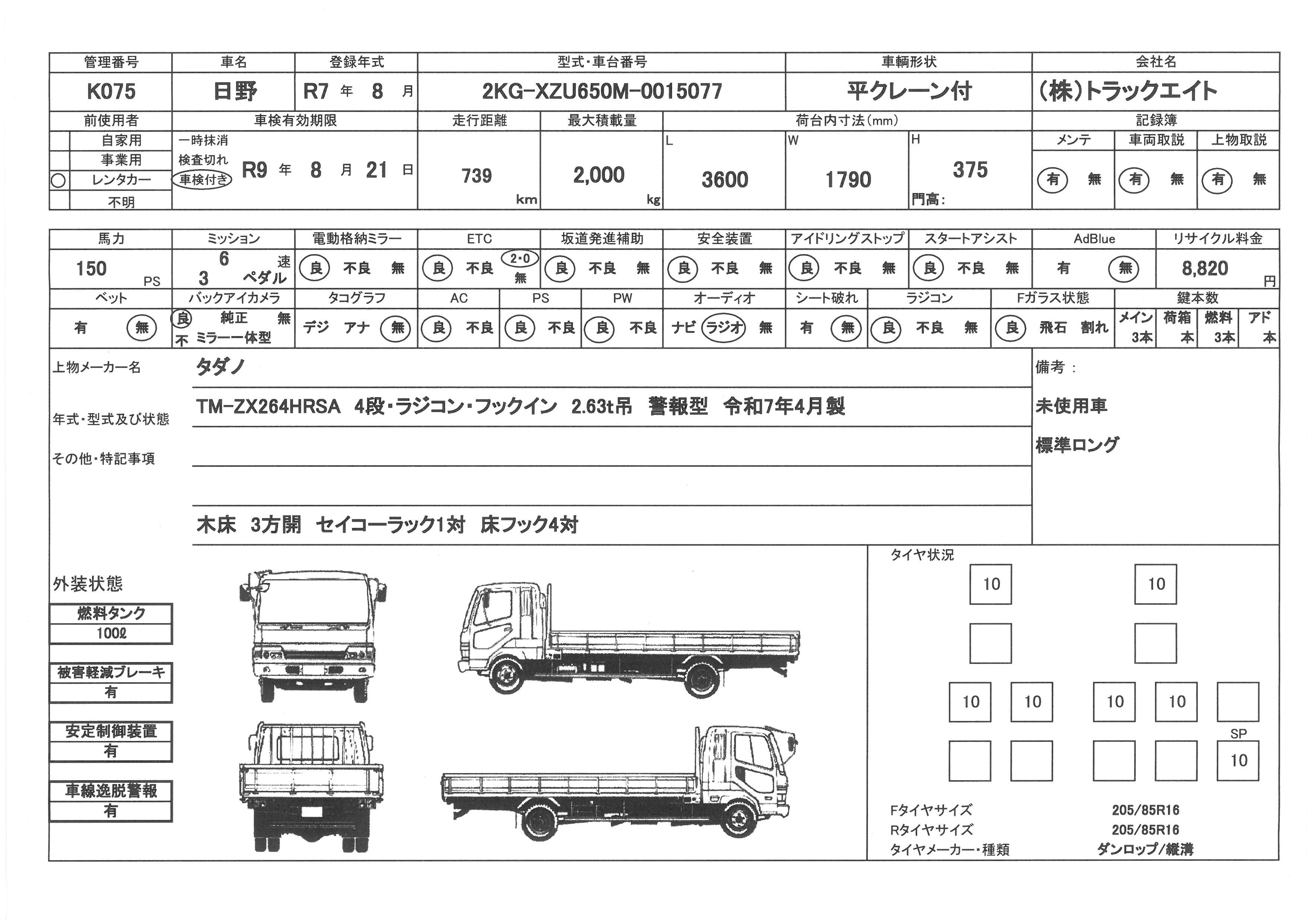 | 走行距離 | 1千km | リサイクル料 | 8820円 | 積載量 | 2000㎏ |