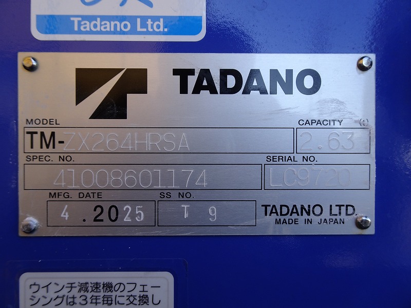 | 上物 | タダノ | 上物形式 | ZX264HRSA | 荷台寸法 | 3.60×1.79×0.38 |